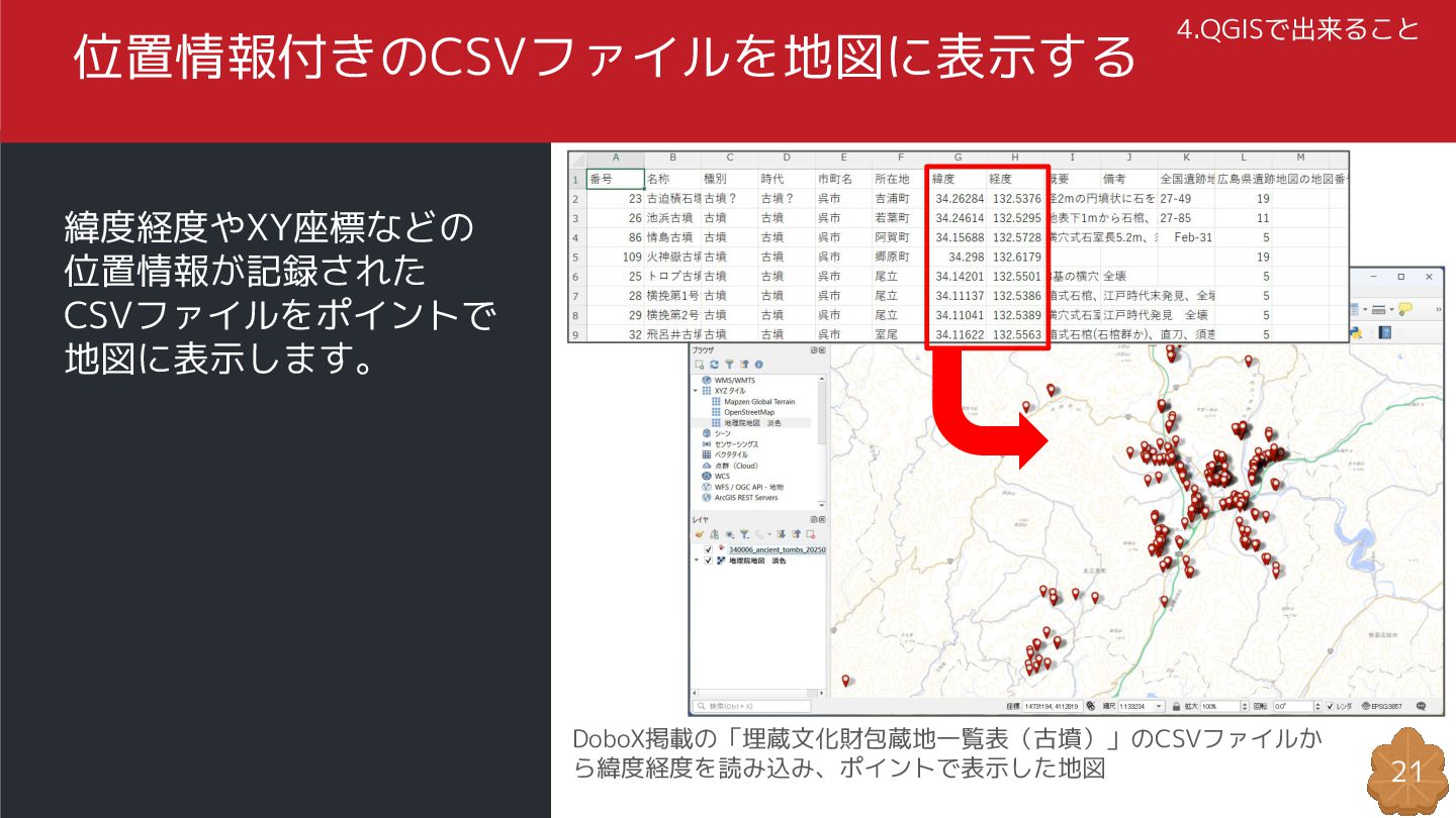 位置情報付きのCSVファイルを地図に表示する 21 緯度経度やXY座標などの 位置情報が記録された CSVファイルをポイントで 地図に表示します。 DoboX掲載の「埋蔵文化財包蔵地一覧表(古墳)」のCSVファイルか ら緯度経度を読み込み、ポイントで表示した地図 4.QGISで出来ること