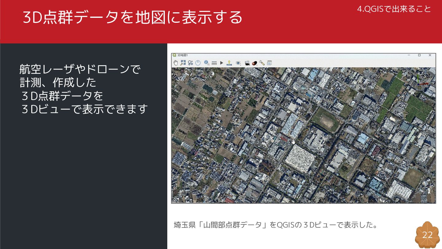 3D点群データを地図に表示する 22 航空レーザやドローンで 計測、作成した 3D点群データを 3Dビューで表示できます 埼玉県「山間部点群データ」をQGISの3Dビューで表示した。 4.QGISで出来ること