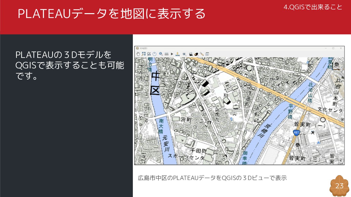 PLATEAUデータを地図に表示する 23 PLATEAUの3Dモデルを QGISで表示することも可能 です。 広島市中区のPLATEAUデータをQGISの3Dビューで表示 4.QGISで出来ること