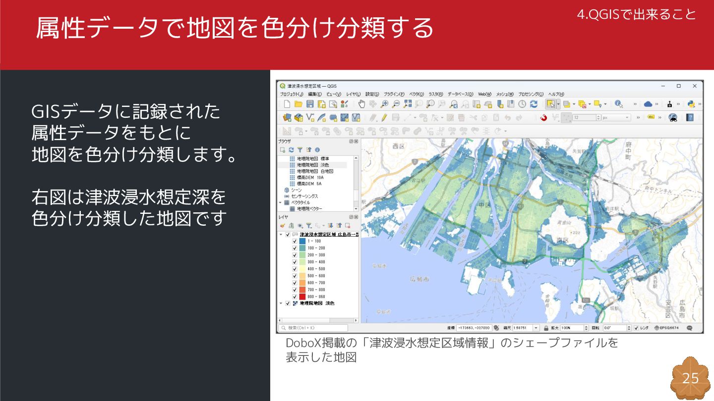 属性データで地図を色分け分類する 24 GISデータに記録された 属性データをもとに 地図を色分け分類します。 右図は森林の区域を樹種で 色分けした地図です。 DoboX掲載の「航空レーザ計測に基づく森林資源データ(樹種ポリゴ ンデータ)」シェープファイルを表示した地図 4.QGISで出来ること