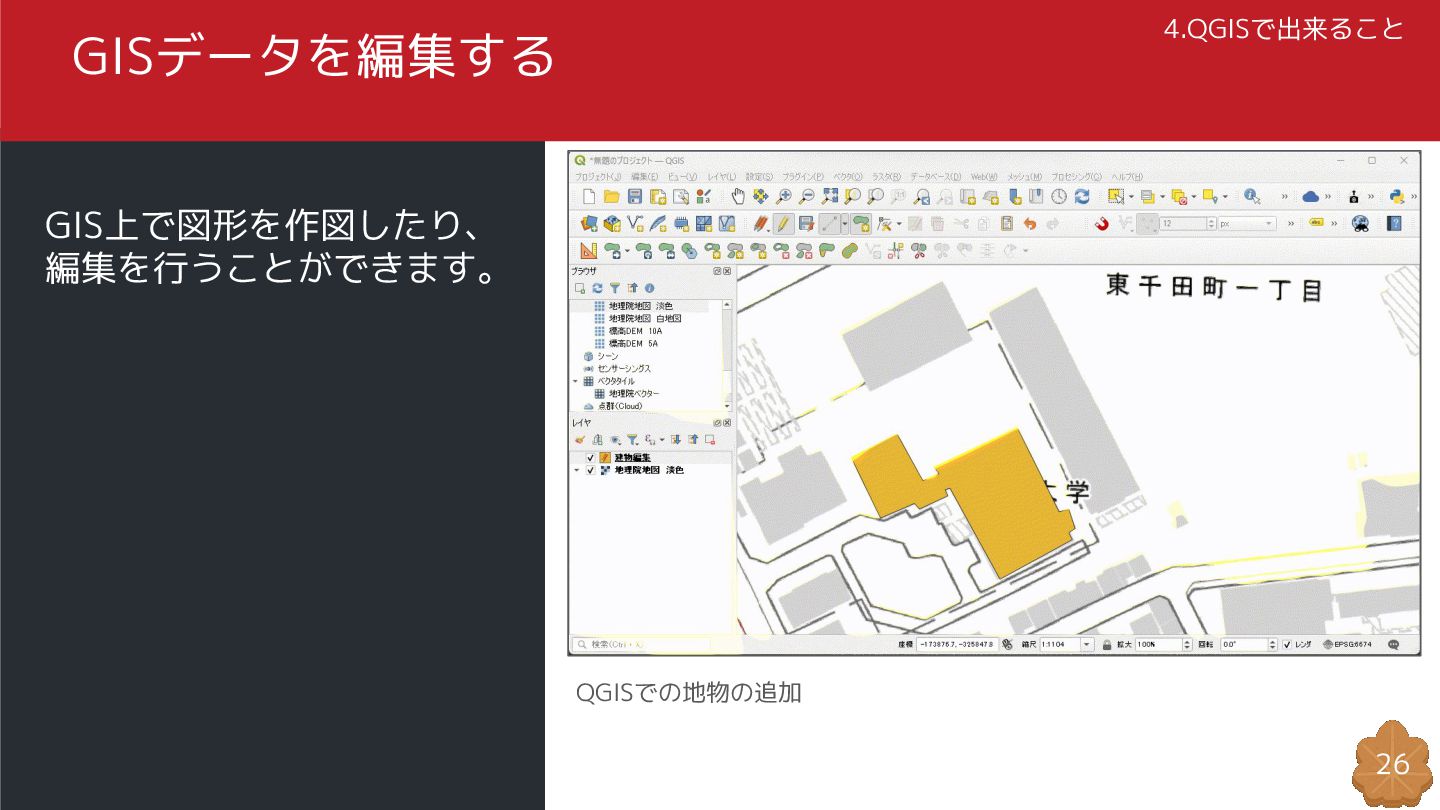 GISデータを編集する 26 GIS上で図形を作図したり、 編集を行うことができます。 QGISでの地物の追加 4.QGISで出来ること