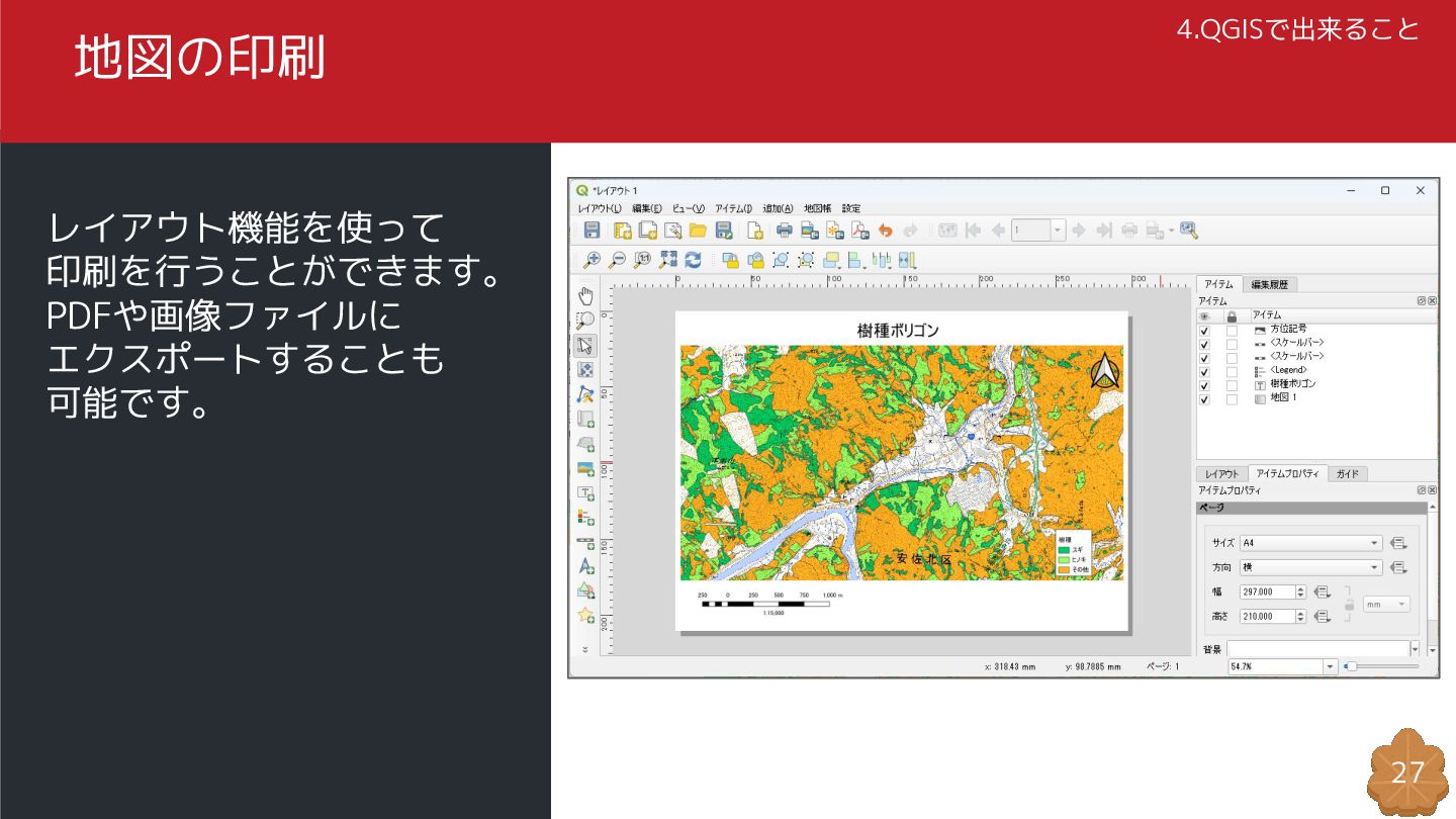 地図の印刷 27 レイアウト機能を使って 印刷を行うことができます。 PDFや画像ファイルに エクスポートすることも 可能です。 4.QGISで出来ること