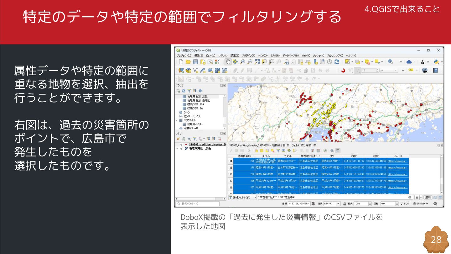 特定のデータや特定の範囲でフィルタリングする 28 属性データや特定の範囲に 重なる地物を選択、抽出を 行うことができます。 右図は、過去の災害箇所の ポイントで、広島市で 発生したものを 選択したものです。 DoboX掲載の「過去に発生した災害情報」のCSVファイルを