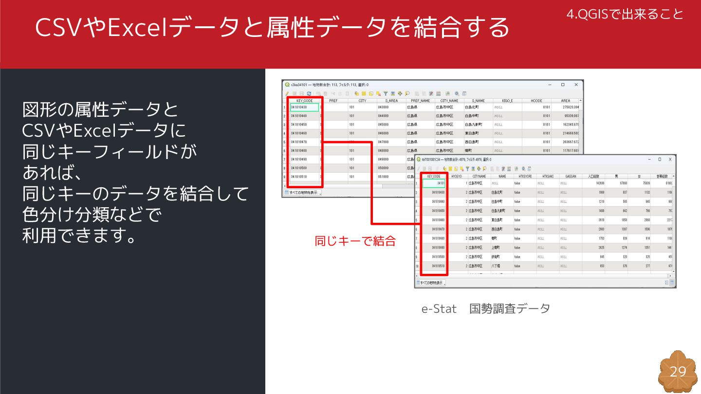 CSVやExcelデータと属性データを結合する 29 図形の属性データと CSVやExcelデータに 同じキーフィールドが あれば、 同じキーのデータを結合して 色分け分類などで 利用できます。 e-Stat 国勢調査データ