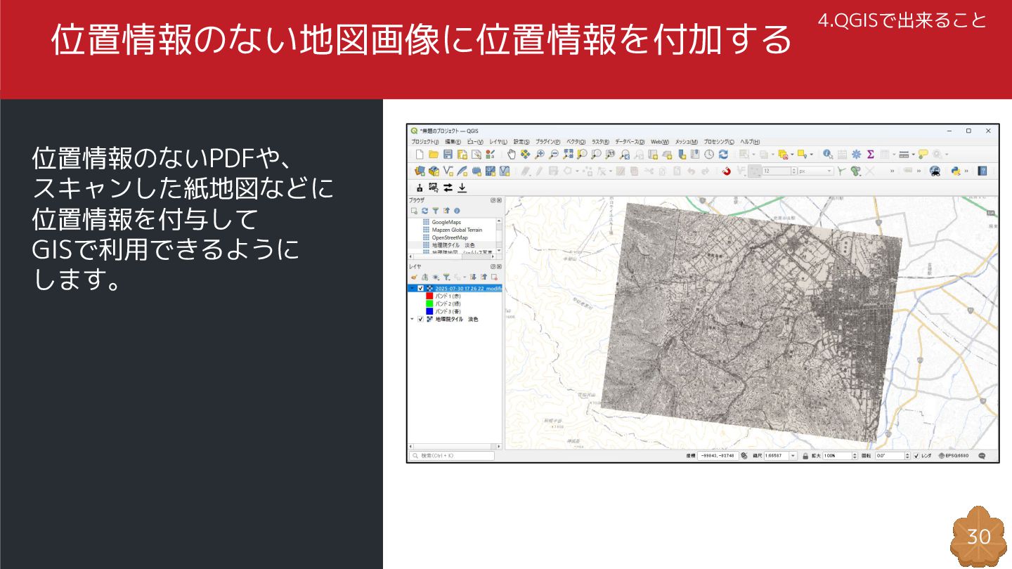 位置情報のない地図画像に位置情報を付加する 30 位置情報のないPDFや、 スキャンした紙地図などに 位置情報を付与して GISで利用できるように します。 4.QGISで出来ること