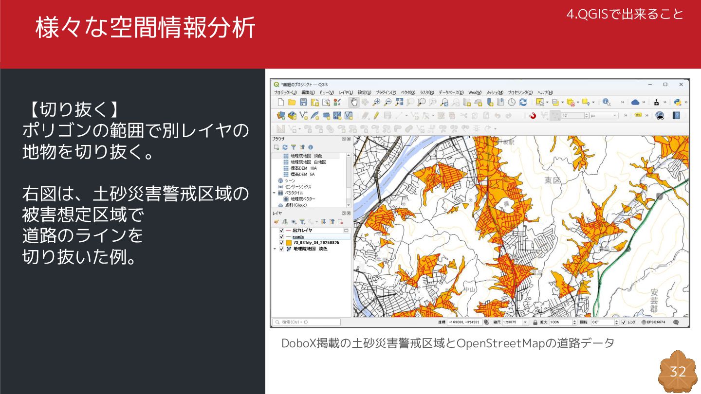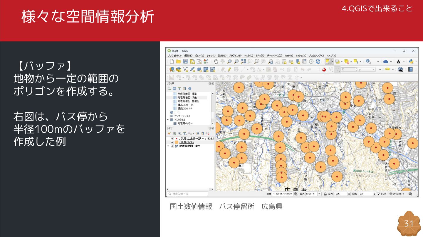 様々な空間情報分析 31 【バッファ】 地物から一定の範囲の ポリゴンを作成する。 右図は、バス停から 半径100mのバッファを 作成した例 国土数値情報 バス停留所 広島県 4.QGISで出来ること