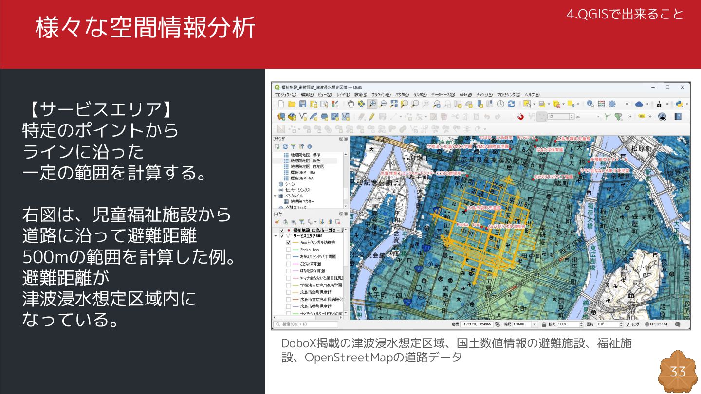 様々な空間情報分析 32 【切り抜く】 ポリゴンの範囲で別レイヤの 地物を切り抜く。 右図は、土砂災害警戒区域の 被害想定区域で 道路のラインを 切り抜いた例。 DoboX掲載の土砂災害警戒区域とOpenStreetMapの道路データ