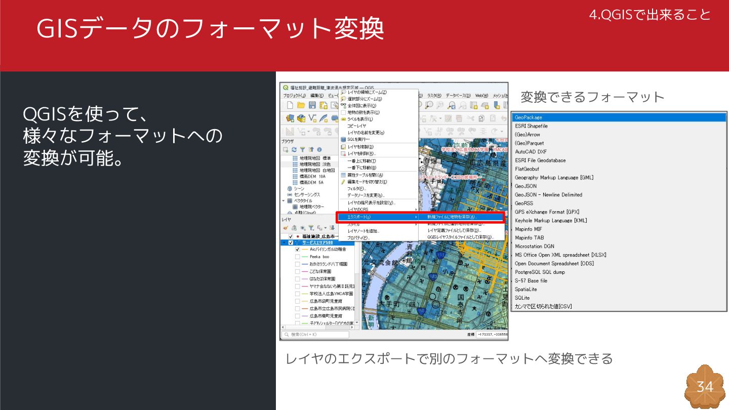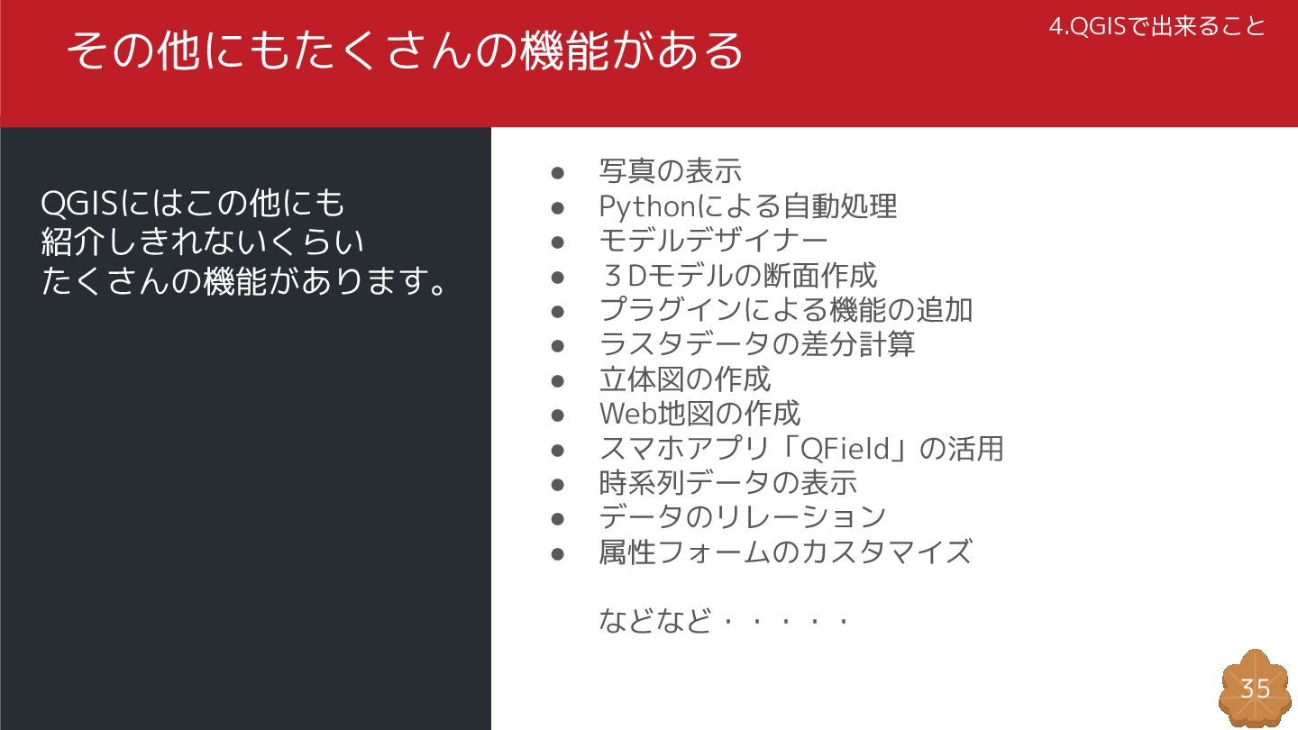 GISデータのフォーマット変換 34 QGISを使って、 様々なフォーマットへの 変換が可能。 変換できるフォーマット レイヤのエクスポートで別のフォーマットへ変換できる 4.QGISで出来ること