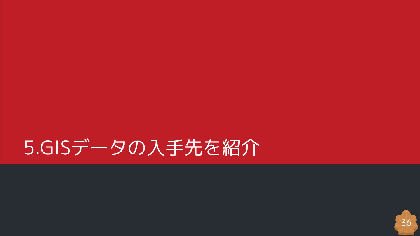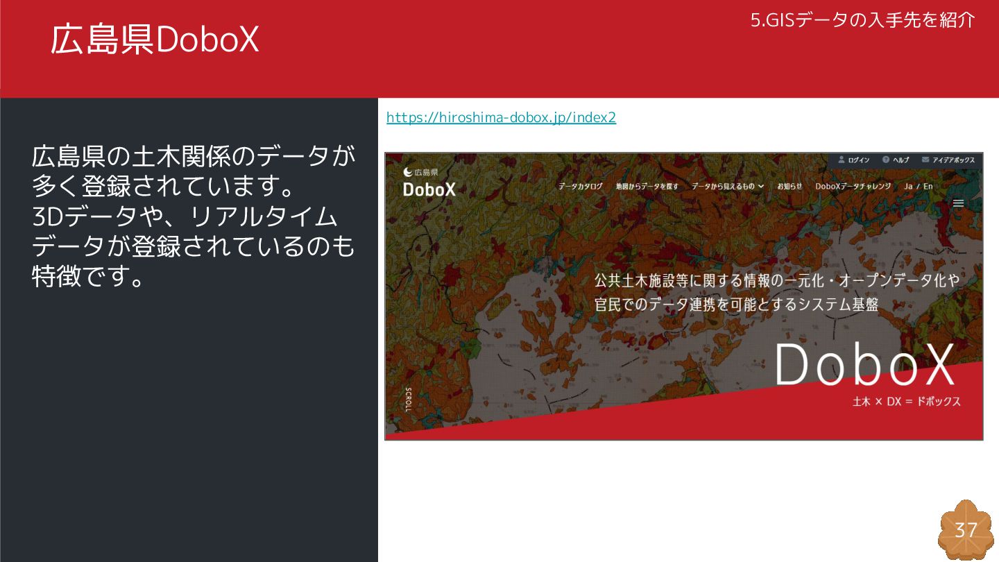 広島県DoboX 37 広島県の土木関係のデータが 多く登録されています。 3Dデータや、リアルタイム データが登録されているのも 特徴です。 https://hiroshima-dobox.jp/index2 5.GISデータの入手先を紹介
