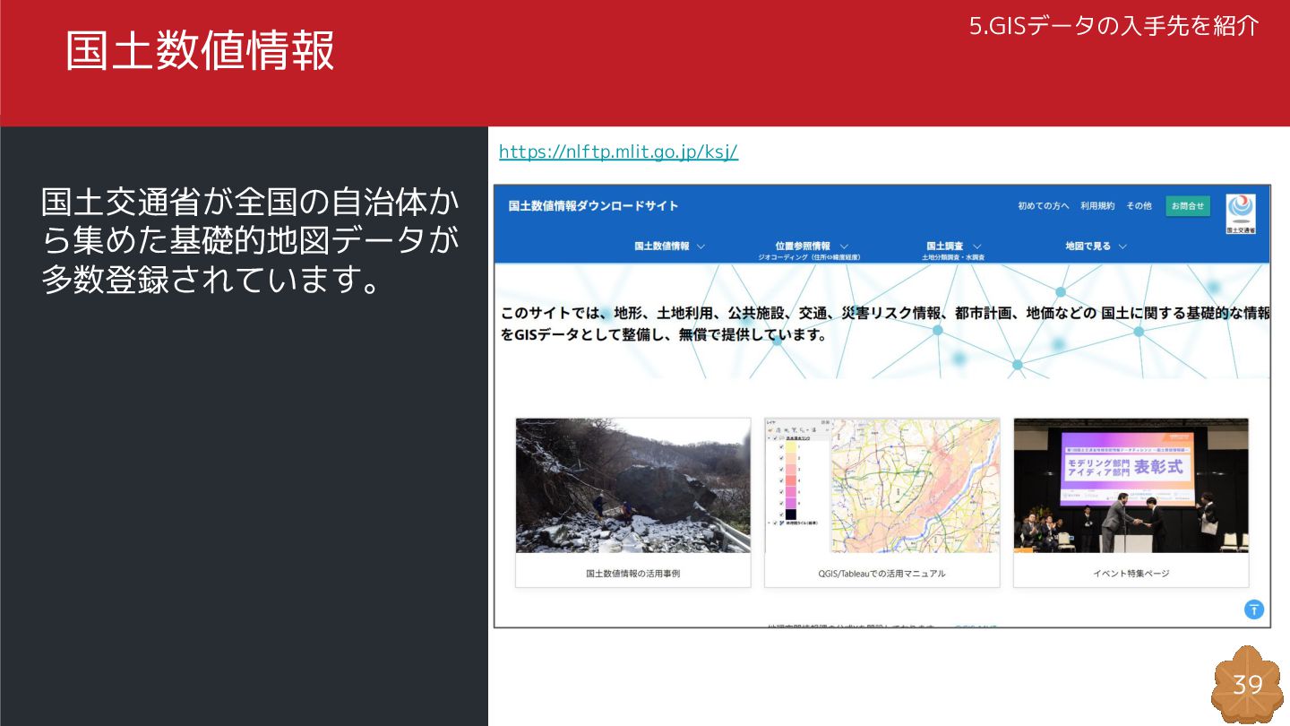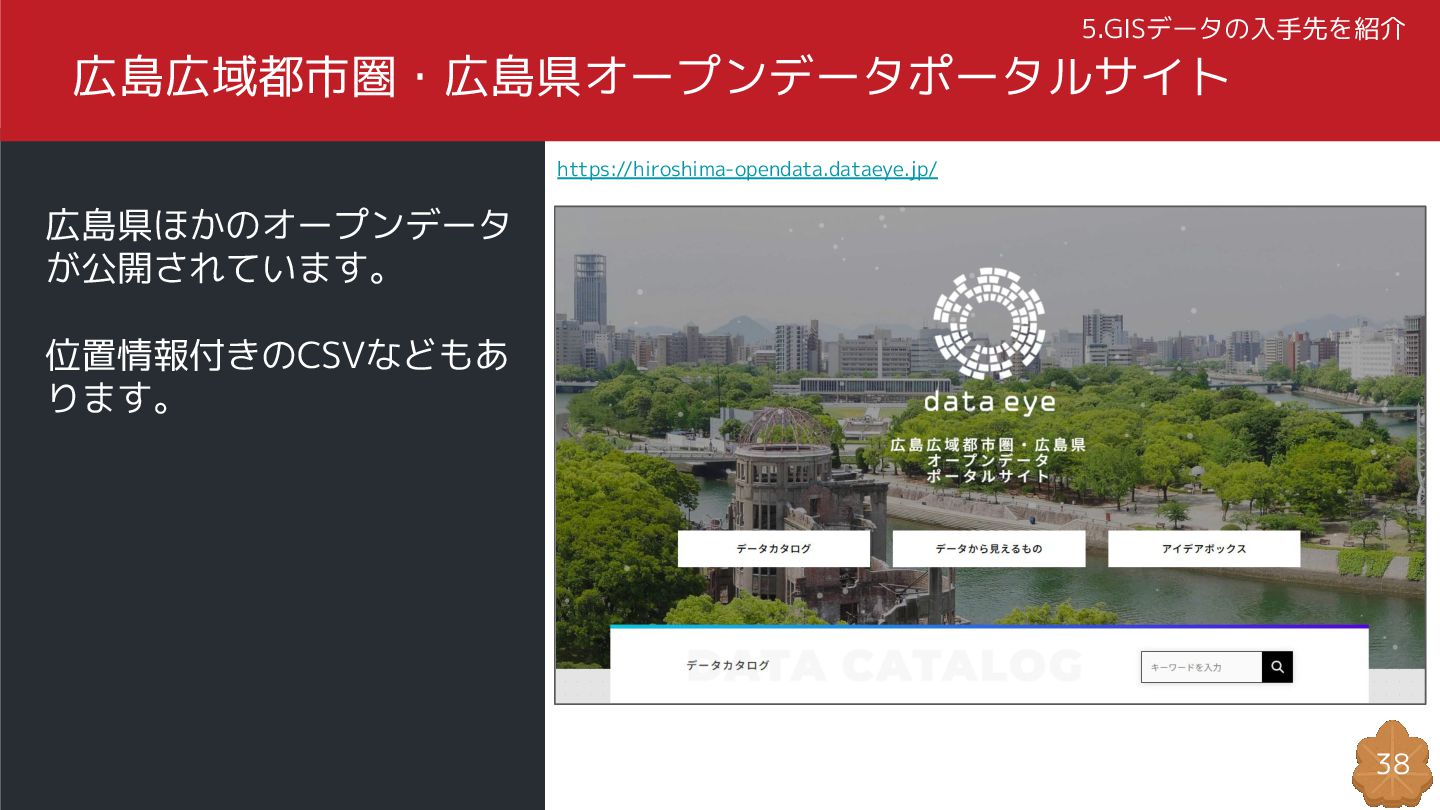 広島広域都市圏・広島県オープンデータポータルサイト 38 広島県ほかのオープンデータ が公開されています。 位置情報付きのCSVなどもあ ります。 https://hiroshima-opendata.dataeye.jp/ 5.GISデータの入手先を紹介