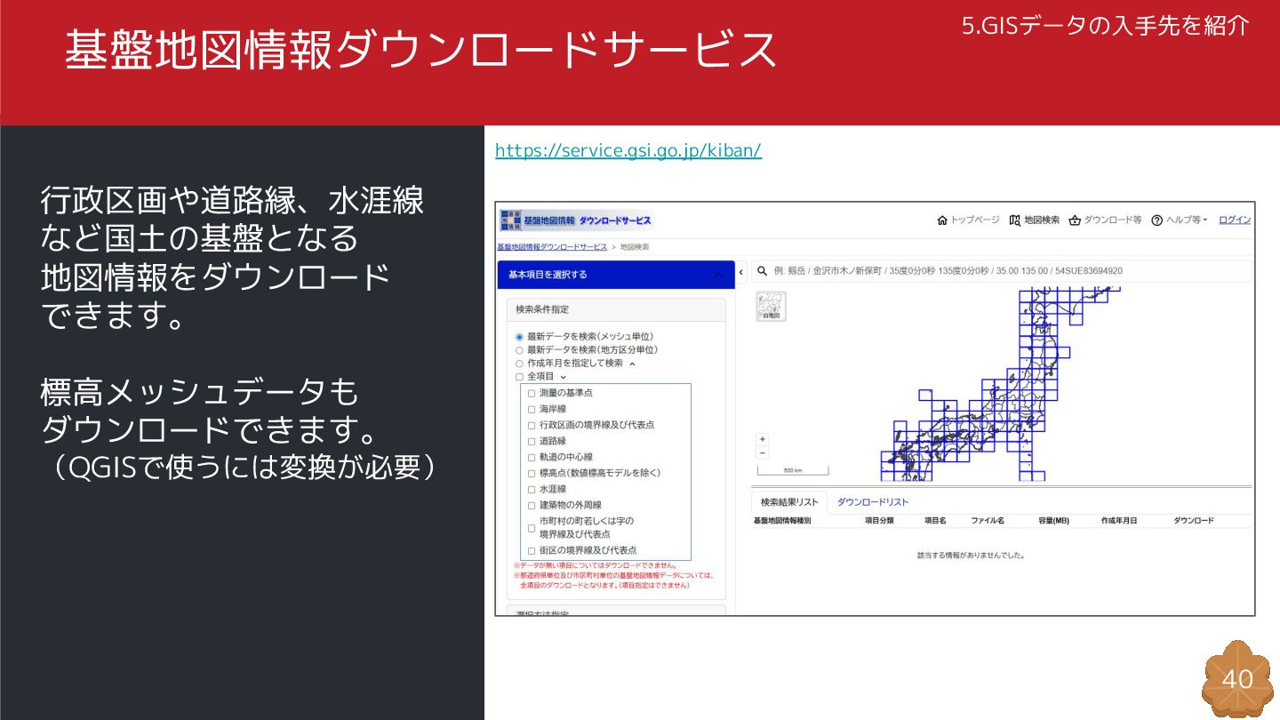 国土数値情報 39 国土交通省が全国の自治体か ら集めた基礎的地図データが 多数登録されています。 https://nlftp.mlit.go.jp/ksj/ 5.GISデータの入手先を紹介