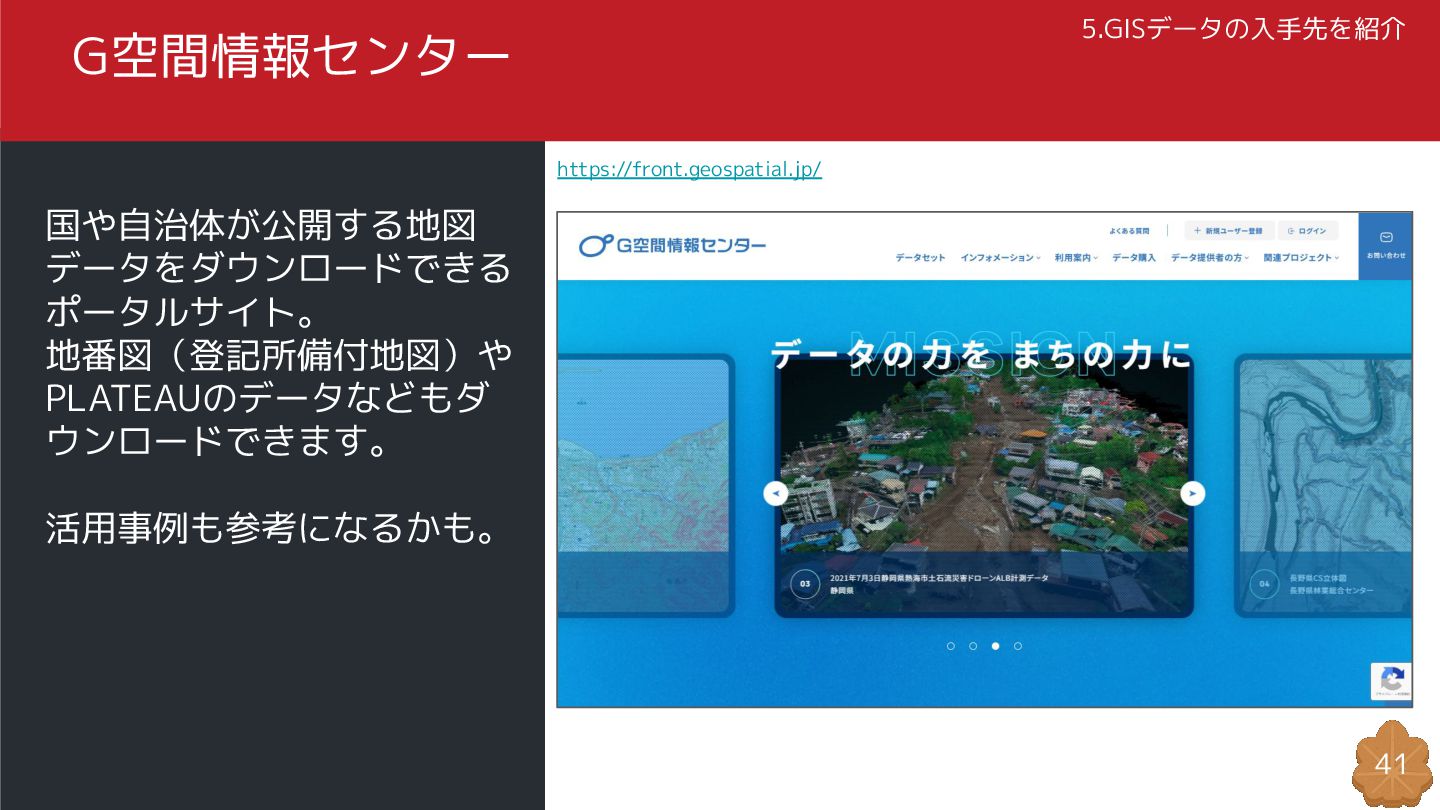 G空間情報センター 41 国や自治体が公開する地図 データをダウンロードできる ポータルサイト。 地番図(登記所備付地図)や PLATEAUのデータなどもダ ウンロードできます。 活用事例も参考になるかも。 https://front.geospatial.jp/