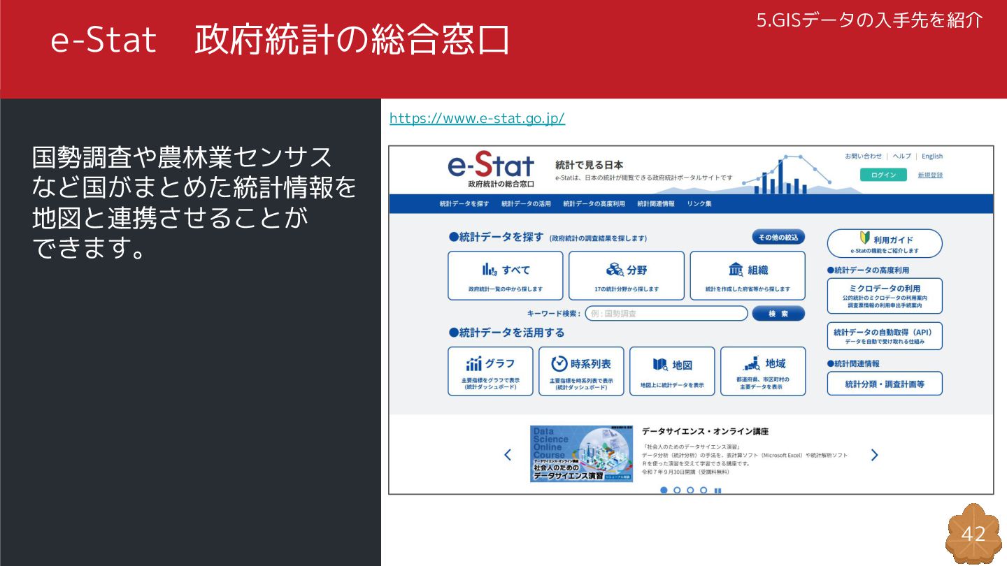 e-Stat 政府統計の総合窓口 42 国勢調査や農林業センサス など国がまとめた統計情報を 地図と連携させることが できます。 https://www.e-stat.go.jp/ 5.GISデータの入手先を紹介