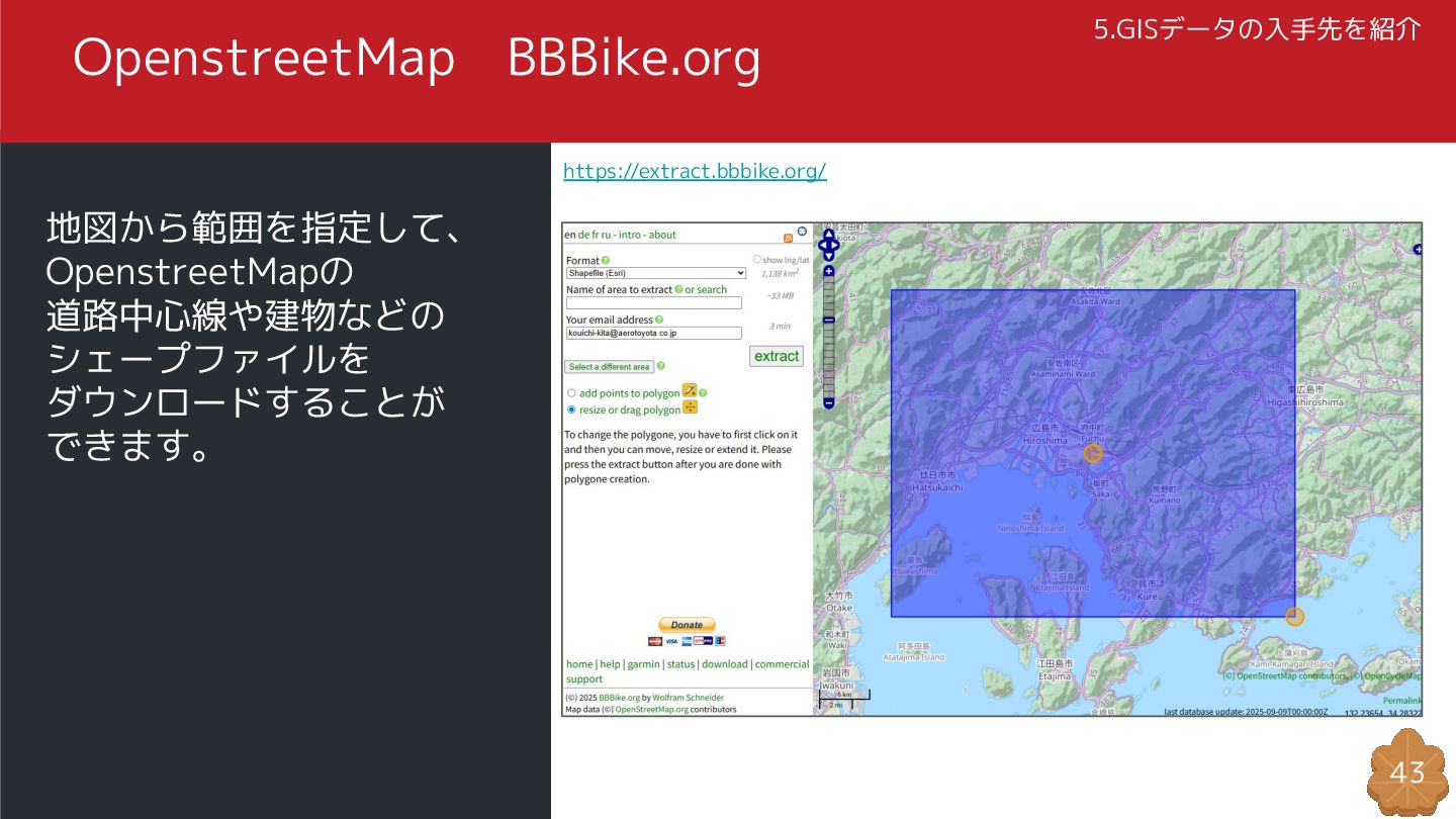OpenstreetMap BBBike.org 43 地図から範囲を指定して、 OpenstreetMapの 道路中心線や建物などの シェープファイルを ダウンロードすることが できます。 https://extract.bbbike.org/ 5.GISデータの入手先を紹介