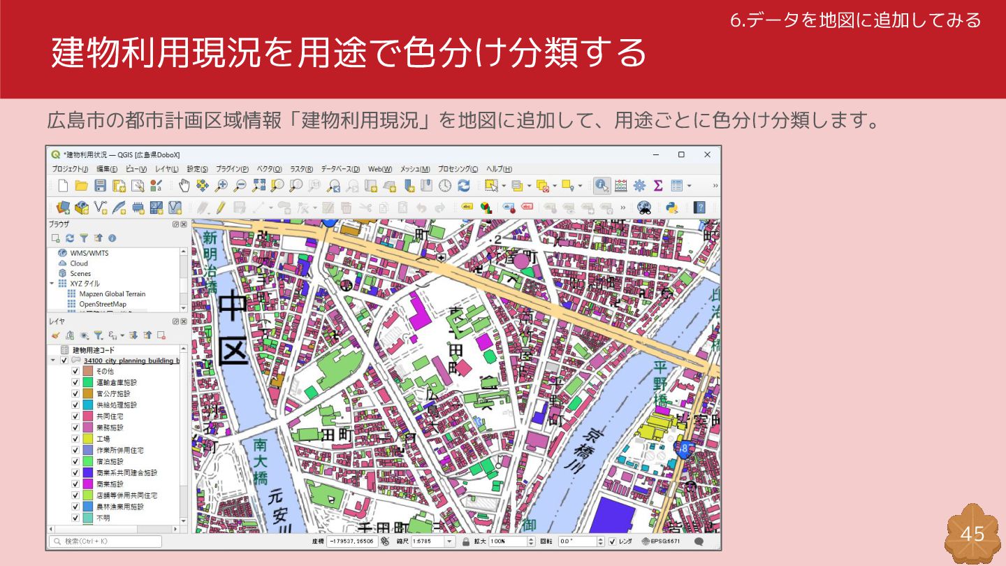 建物利用現況を用途で色分け分類する 45 広島市の都市計画区域情報「建物利用現況」を地図に追加して、用途ごとに色分け分類します。 6.データを地図に追加してみる