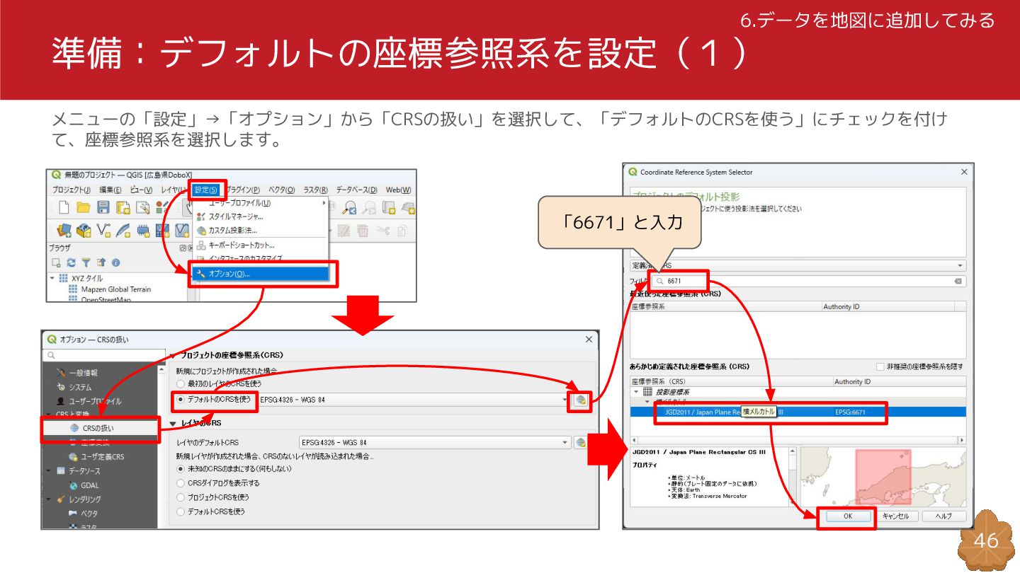 準備:デフォルトの座標参照系を設定(1) 46 メニューの「設定」→「オプション」から「CRSの扱い」を選択して、「デフォルトのCRSを使う」にチェックを付け て、座標参照系を選択します。 「6671」と入力 6.データを地図に追加してみる