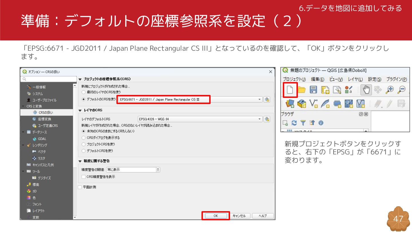 III」となっているのを確認して、「OK」ボタンをクリックし ます。 新規プロジェクトボタンをクリックす ると、右下の「EPSG」が「6671」に 変わります。 6.データを地図に追加してみる