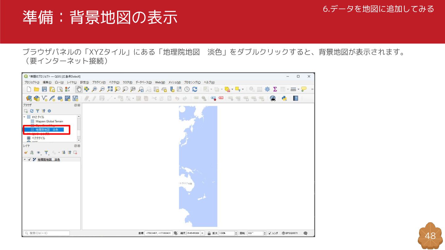 準備:背景地図の表示 48 ブラウザパネルの「XYZタイル」にある「地理院地図 淡色」をダブルクリックすると、背景地図が表示されます。 (要インターネット接続) 6.データを地図に追加してみる