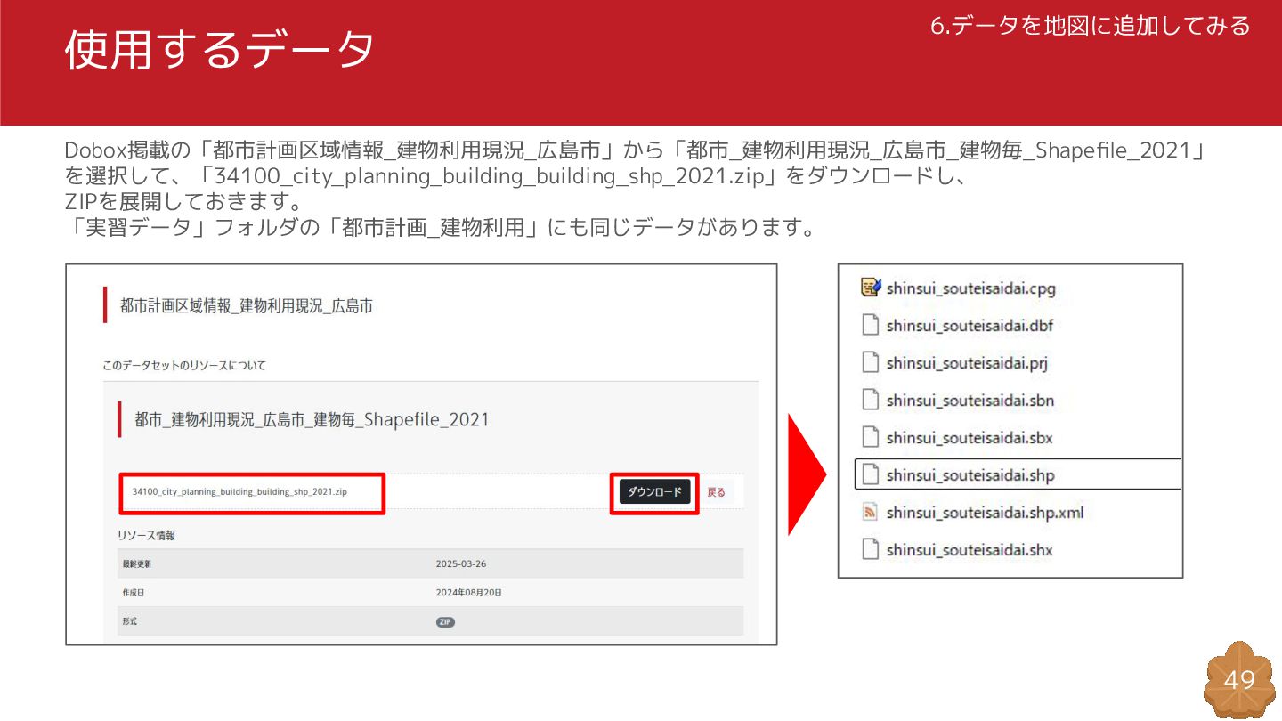 使用するデータ 49 Dobox掲載の「都市計画区域情報_建物利用現況_広島市」から「都市_建物利用現況_広島市_建物毎_Shapefile_2021」 を選択して、「34100_city_planning_building_building_shp_2021.zip」をダウンロードし、 ZIPを展開しておきます。 「実習データ」フォルダの「都市計画_建物利用」にも同じデータがあります。 6.データを地図に追加してみる