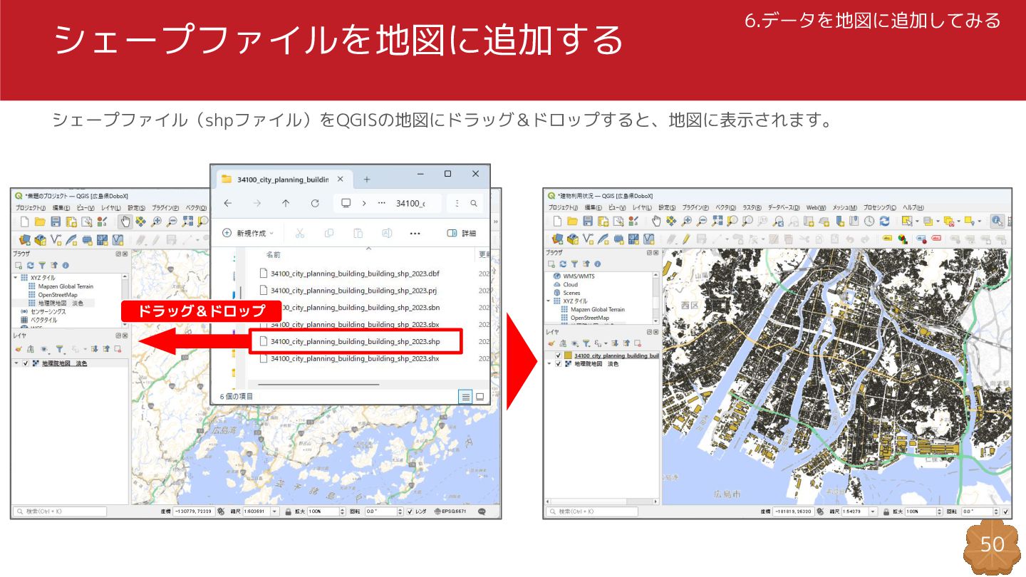 シェープファイルを地図に追加する 50 シェープファイル(shpファイル)をQGISの地図にドラッグ&ドロップすると、地図に表示されます。 ドラッグ&ドロップ 6.データを地図に追加してみる