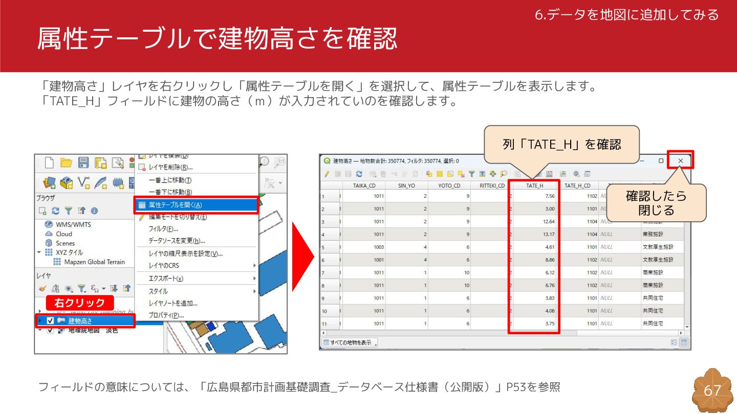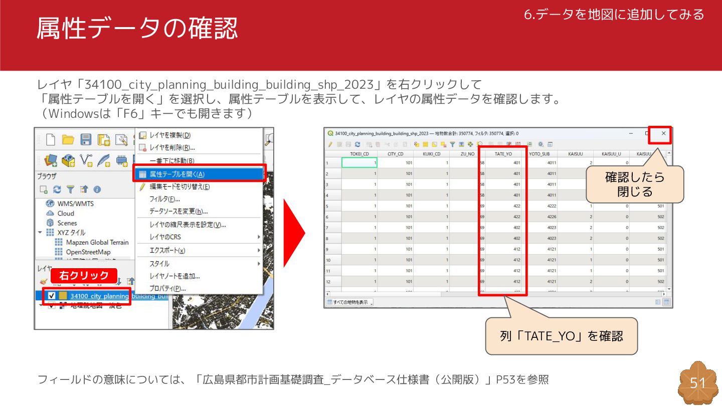 属性データの確認 51 レイヤ「34100_city_planning_building_building_shp_2023」を右クリックして 「属性テーブルを開く」を選択し、属性テーブルを表示して、レイヤの属性データを確認します。 (Windowsは「F6」キーでも開きます) 6.データを地図に追加してみる 右クリック 列「TATE_YO」を確認 確認したら 閉じる