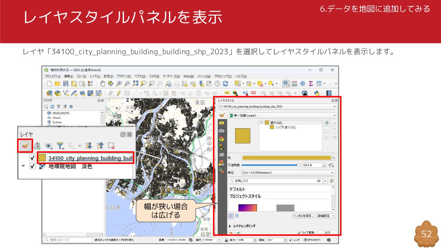 レイヤスタイルパネルを表示 52 レイヤ「34100_city_planning_building_building_shp_2023」を選択してレイヤスタイルパネルを表示します。 6.データを地図に追加してみる 幅が狭い場合 は広げる
