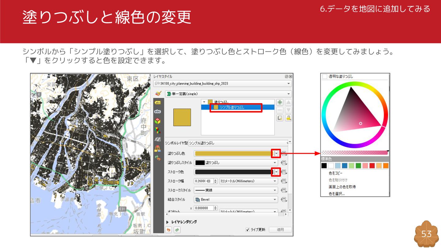 塗りつぶしと線色の変更 53 シンボルから「シンプル塗りつぶし」を選択して、塗りつぶし色とストローク色(線色)を変更してみましょう。 「▼」をクリックすると色を設定できます。 6.データを地図に追加してみる