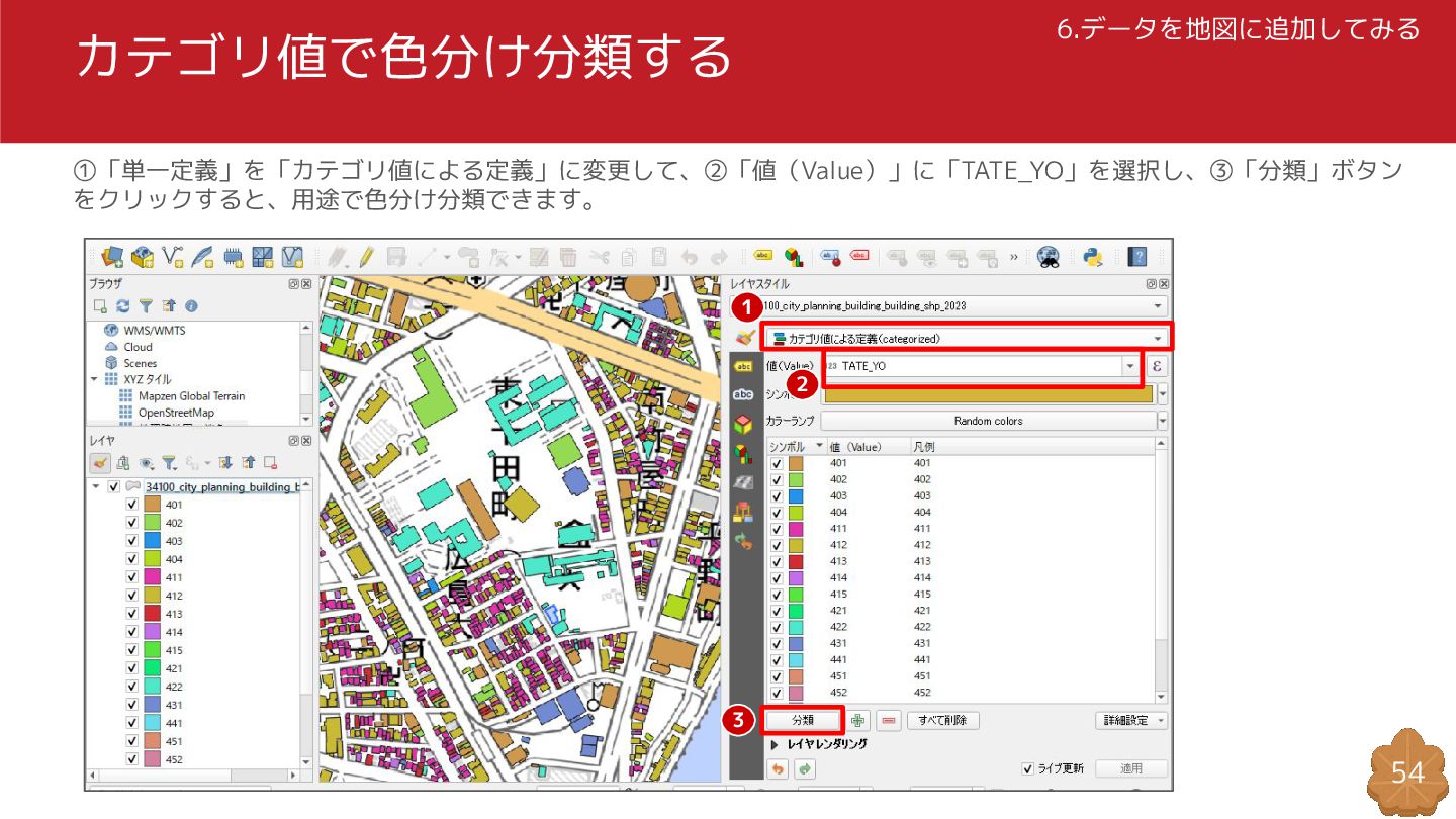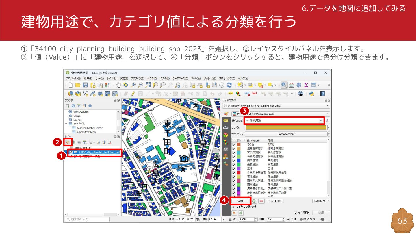 建物用途で、カテゴリ値による分類を行う 63 ①「34100_city_planning_building_building_shp_2023」を選択し、②レイヤスタイルパネルを表示します。 ③「値(Value)」に「建物用途」を選択して、④「分類」ボタンをクリックすると、建物用途で色分け分類できます。 6.データを地図に追加してみる 1 2 3 4