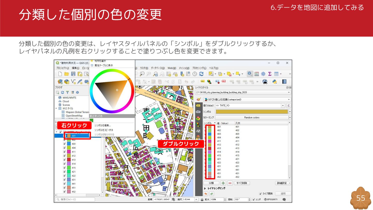 分類した個別の色の変更 55 分類した個別の色の変更は、レイヤスタイルパネルの「シンボル」をダブルクリックするか、 レイヤパネルの凡例を右クリックすることで塗りつぶし色を変更できます。 6.データを地図に追加してみる 右クリック ダブルクリック