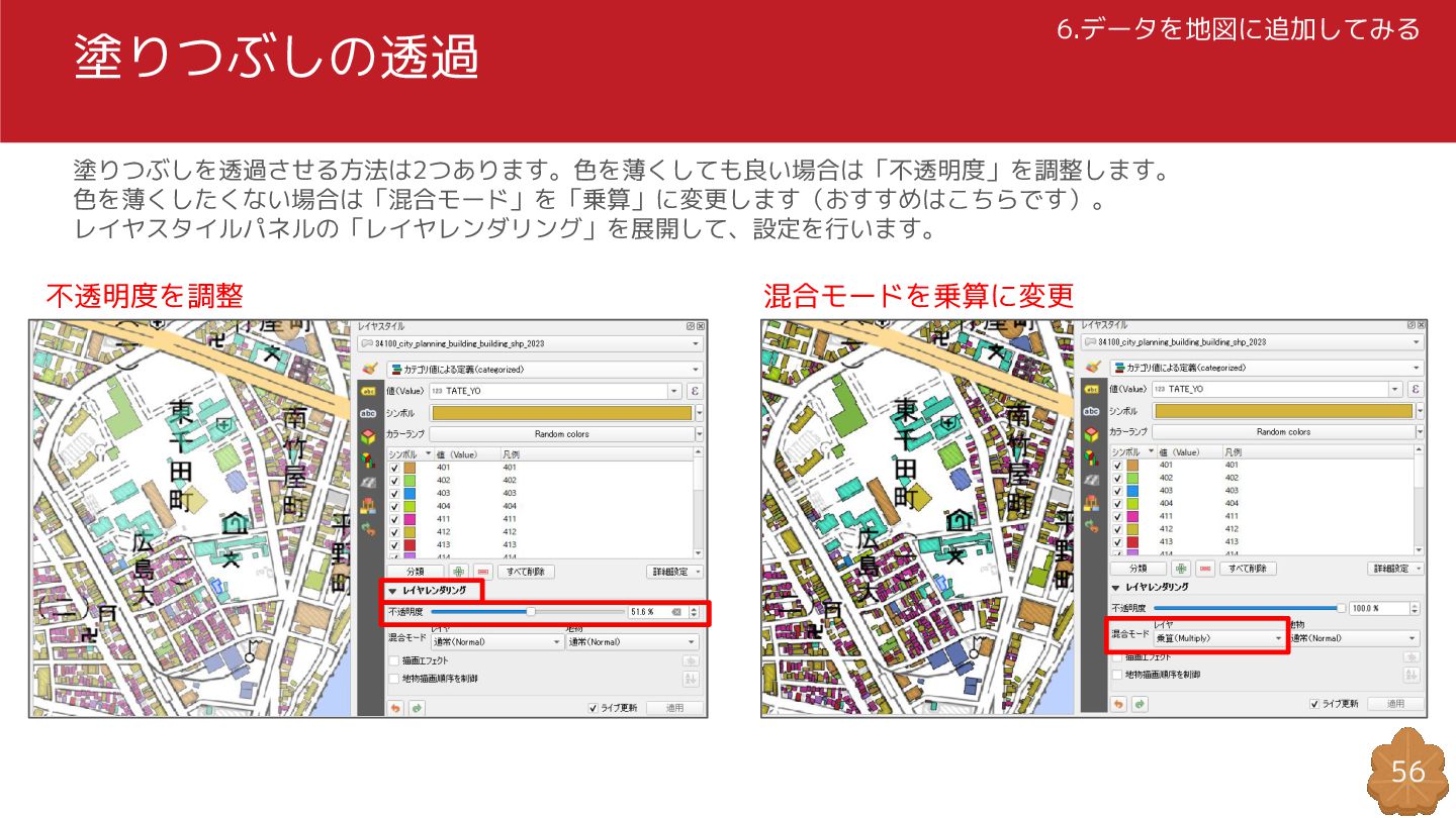 塗りつぶしの透過 56 塗りつぶしを透過させる方法は2つあります。色を薄くしても良い場合は「不透明度」を調整します。 色を薄くしたくない場合は「混合モード」を「乗算」に変更します(おすすめはこちらです)。 レイヤスタイルパネルの「レイヤレンダリング」を展開して、設定を行います。 6.データを地図に追加してみる 不透明度を調整 混合モードを乗算に変更