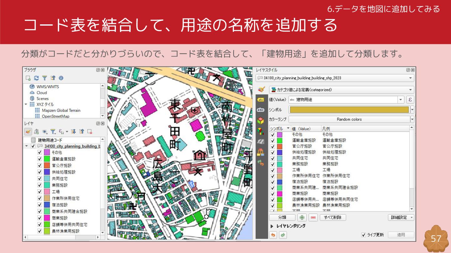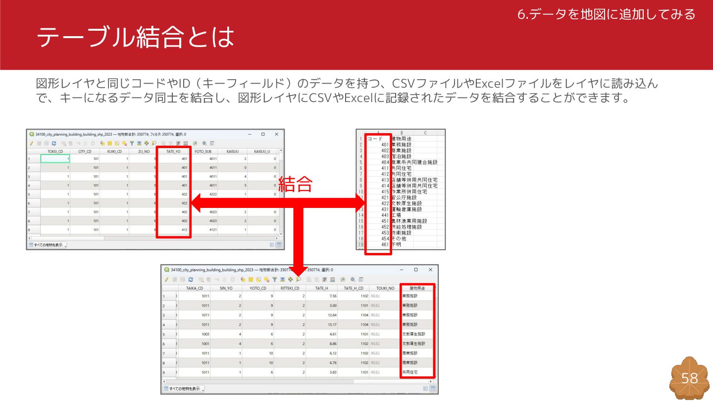 コード表を結合して、用途の名称を追加する 57 分類がコードだと分かりづらいので、コード表を結合して、「建物用途」を追加して分類します。 6.データを地図に追加してみる