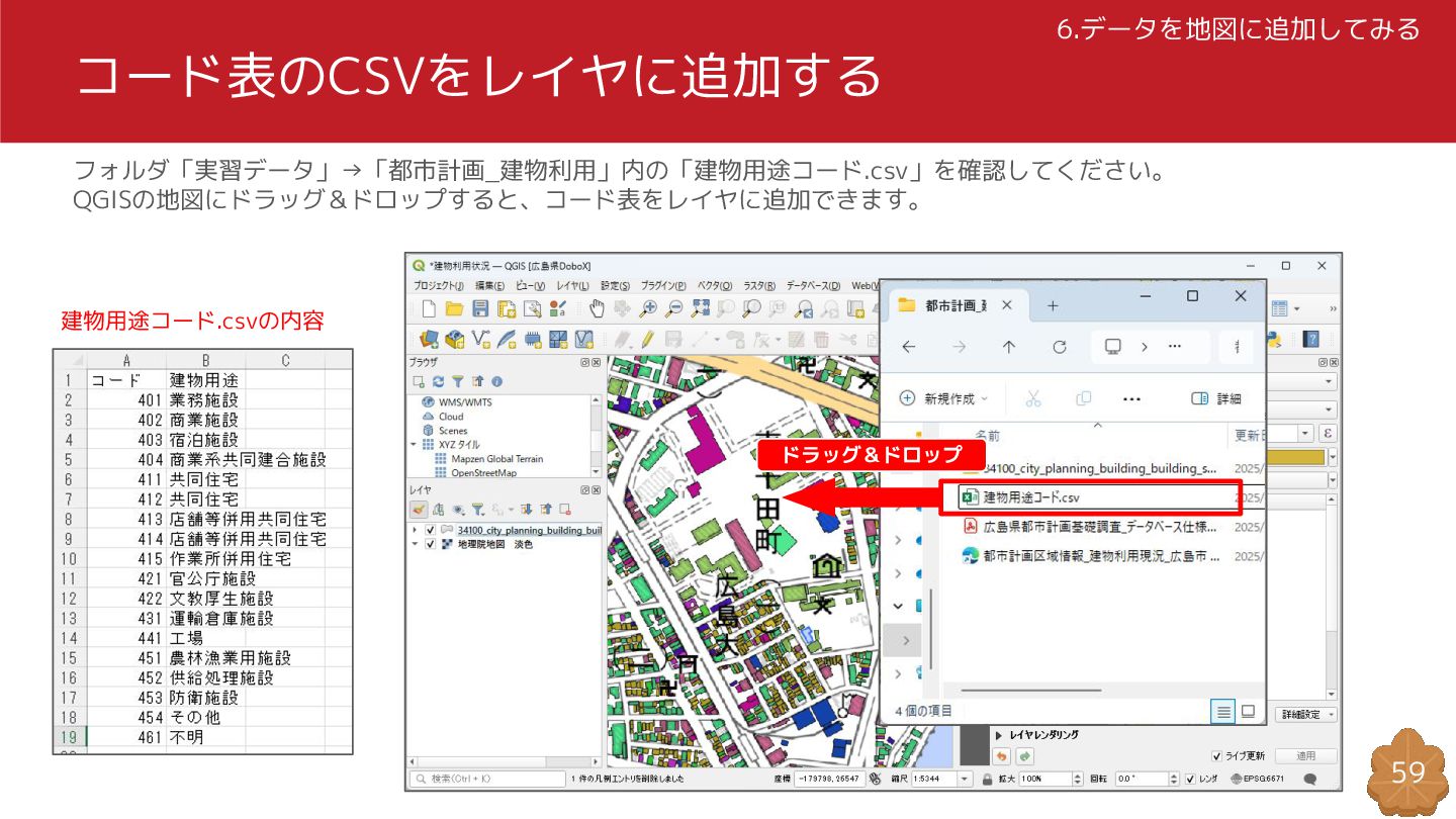 コード表のCSVをレイヤに追加する 59 フォルダ「実習データ」→「都市計画_建物利用」内の「建物用途コード.csv」を確認してください。 QGISの地図にドラッグ&ドロップすると、コード表をレイヤに追加できます。 6.データを地図に追加してみる ドラッグ&ドロップ 建物用途コード.csvの内容