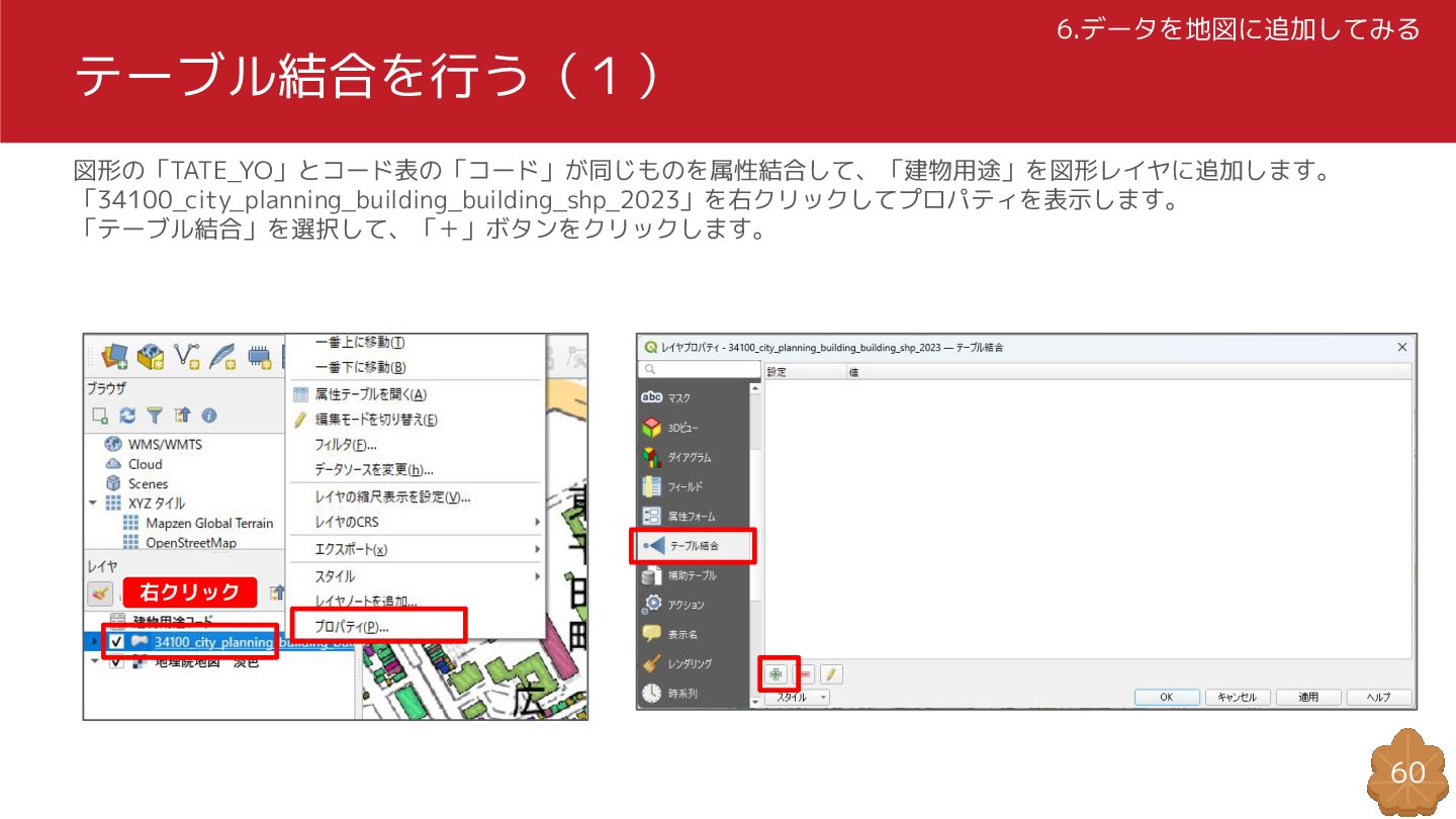 テーブル結合を行う(1) 60 図形の「TATE_YO」とコード表の「コード」が同じものを属性結合して、「建物用途」を図形レイヤに追加します。 「34100_city_planning_building_building_shp_2023」を右クリックしてプロパティを表示します。 「テーブル結合」を選択して、「+」ボタンをクリックします。 6.データを地図に追加してみる 右クリック