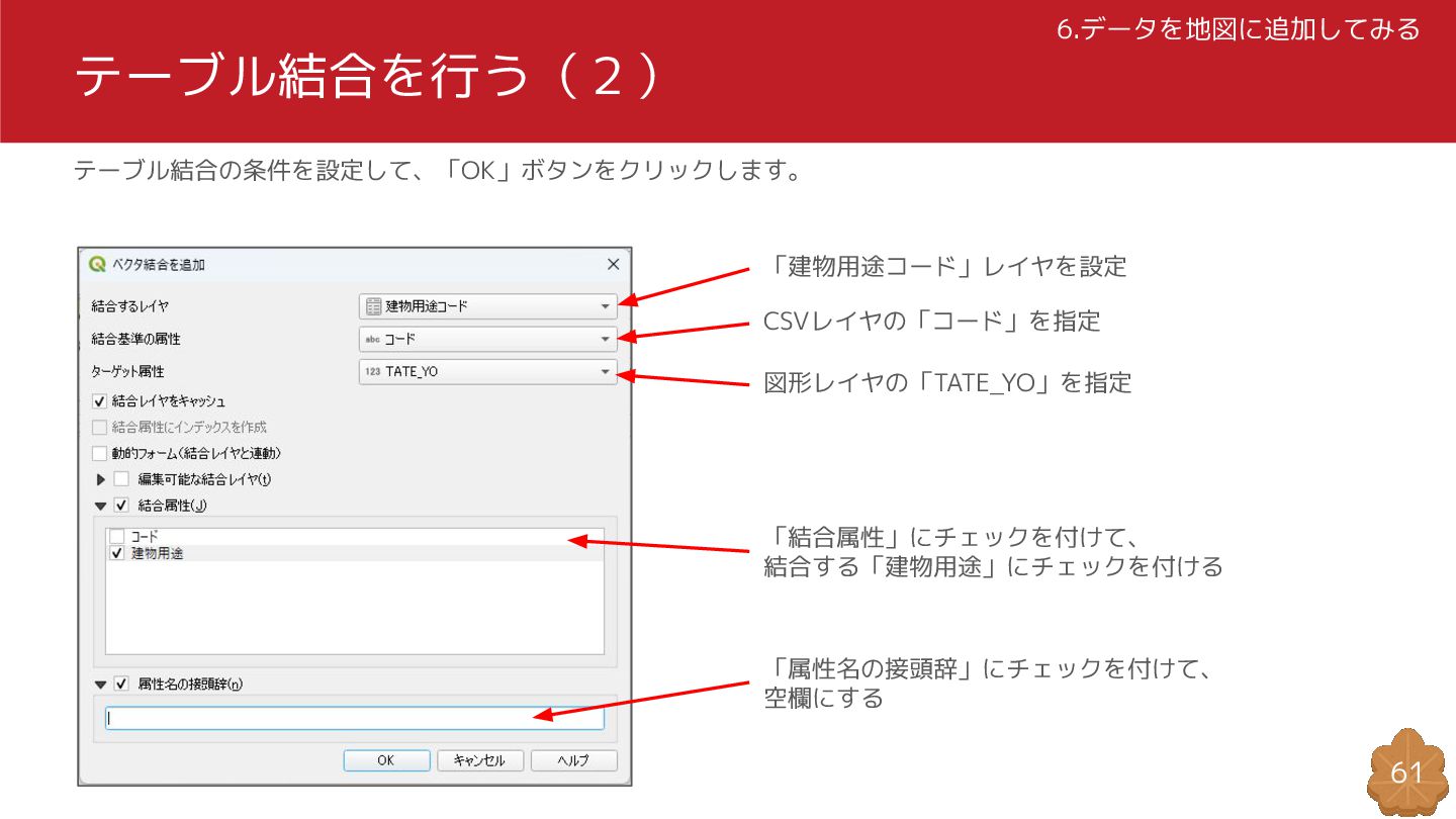 テーブル結合を行う(2) 61 テーブル結合の条件を設定して、「OK」ボタンをクリックします。 6.データを地図に追加してみる 「建物用途コード」レイヤを設定 CSVレイヤの「コード」を指定 図形レイヤの「TATE_YO」を指定 「結合属性」にチェックを付けて、 結合する「建物用途」にチェックを付ける 「属性名の接頭辞」にチェックを付けて、