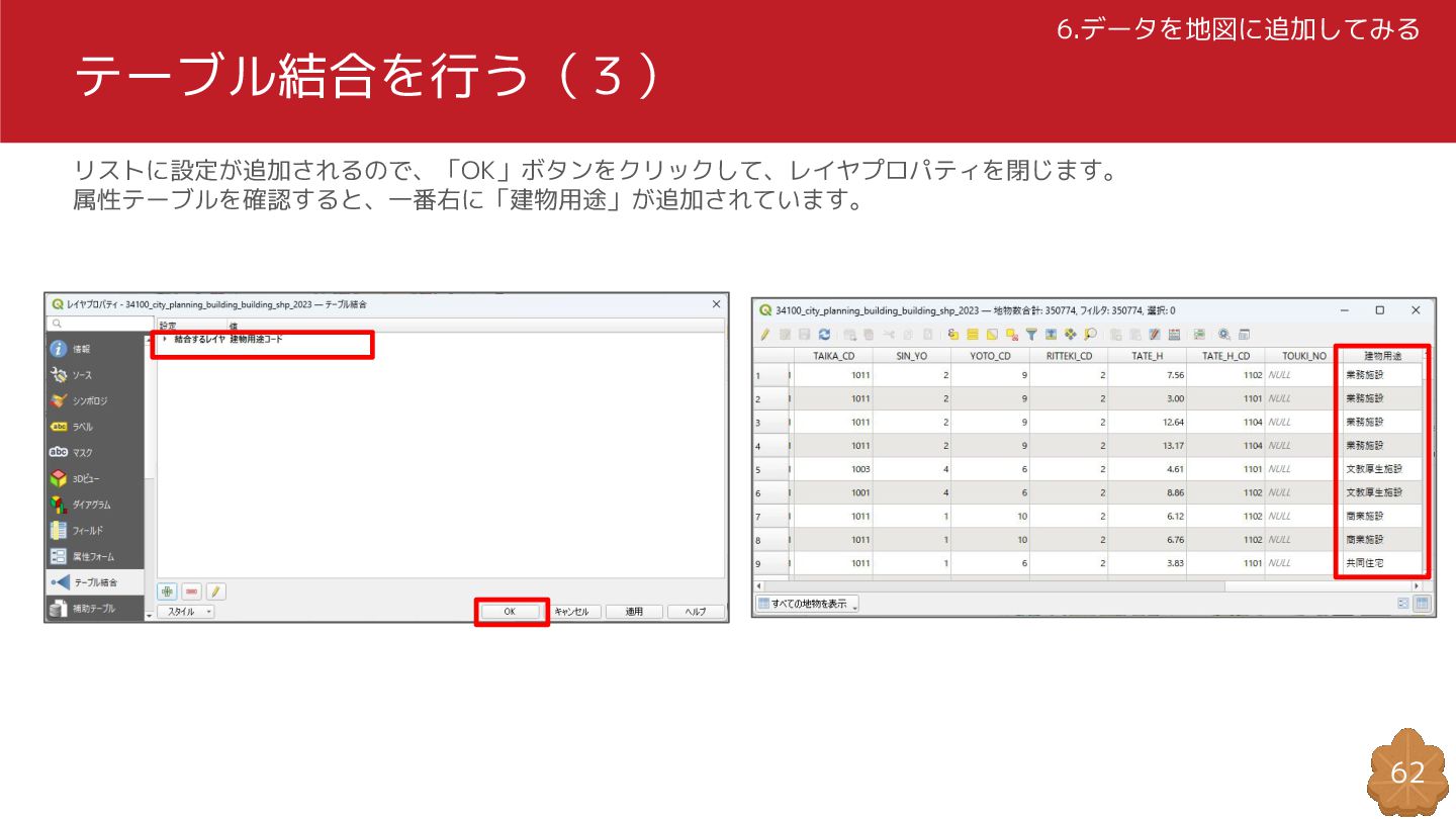 テーブル結合を行う(3) 62 リストに設定が追加されるので、「OK」ボタンをクリックして、レイヤプロパティを閉じます。 属性テーブルを確認すると、一番右に「建物用途」が追加されています。 6.データを地図に追加してみる