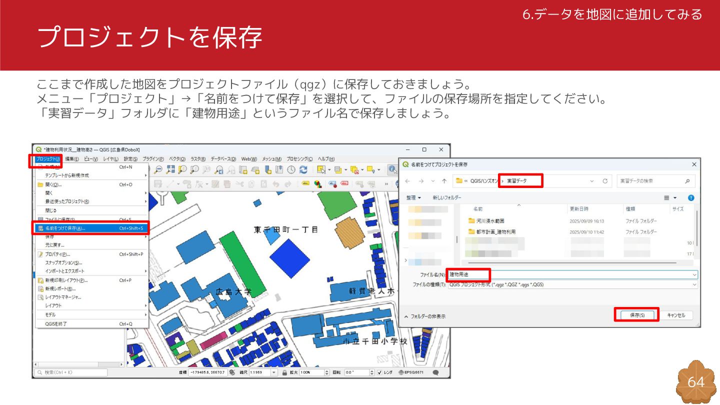 プロジェクトを保存 64 ここまで作成した地図をプロジェクトファイル(qgz)に保存しておきましょう。 メニュー「プロジェクト」→「名前をつけて保存」を選択して、ファイルの保存場所を指定してください。 「実習データ」フォルダに「建物用途」というファイル名で保存しましょう。 6.データを地図に追加してみる