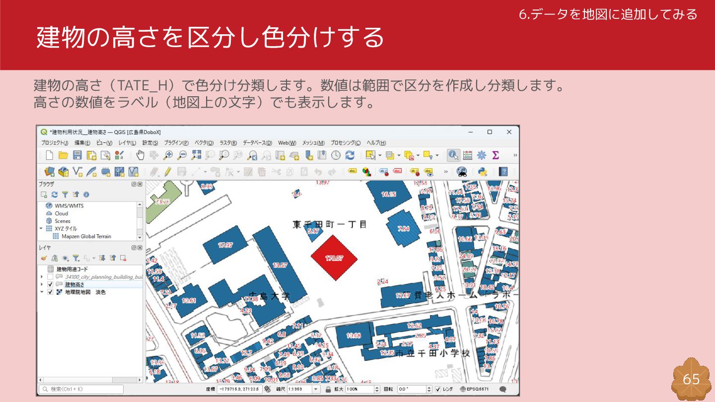 建物の高さを区分し色分けする 65 建物の高さ(TATE_H)で色分け分類します。数値は範囲で区分を作成し分類します。 高さの数値をラベル(地図上の文字)でも表示します。 6.データを地図に追加してみる