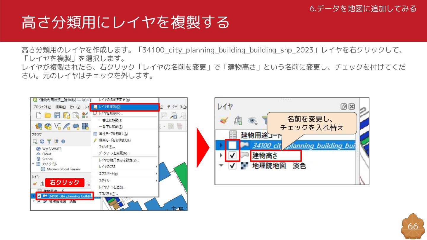 高さ分類用にレイヤを複製する 66 高さ分類用のレイヤを作成します。「34100_city_planning_building_building_shp_2023」レイヤを右クリックして、 「レイヤを複製」を選択します。 レイヤが複製されたら、右クリック「レイヤの名前を変更」で「建物高さ」という名前に変更し、チェックを付けてくだ さい。元のレイヤはチェックを外します。 6.データを地図に追加してみる 名前を変更し、 チェックを入れ替え 右クリック