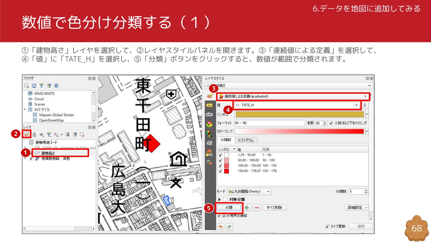 数値で色分け分類する(1) 68 ①「建物高さ」レイヤを選択して、②レイヤスタイルパネルを開きます。③「連続値による定義」を選択して、 ④「値」に「TATE_H」を選択し、⑤「分類」ボタンをクリックすると、数値が範囲で分類されます。 6.データを地図に追加してみる 1 2 3 4 5