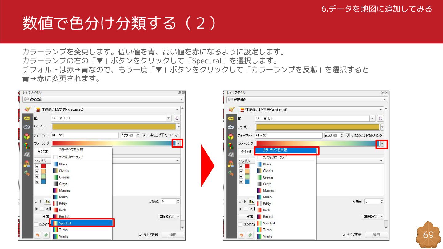 数値で色分け分類する(2) 69 カラーランプを変更します。低い値を青、高い値を赤になるように設定します。 カラーランプの右の「▼」ボタンをクリックして「Spectral」を選択します。 デフォルトは赤→青なので、もう一度「▼」ボタンをクリックして「カラーランプを反転」を選択すると 青→赤に変更されます。 6.データを地図に追加してみる