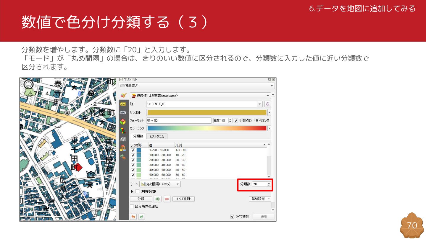 数値で色分け分類する(3) 70 分類数を増やします。分類数に「20」と入力します。 「モード」が「丸め間隔」の場合は、きりのいい数値に区分されるので、分類数に入力した値に近い分類数で 区分されます。 6.データを地図に追加してみる
