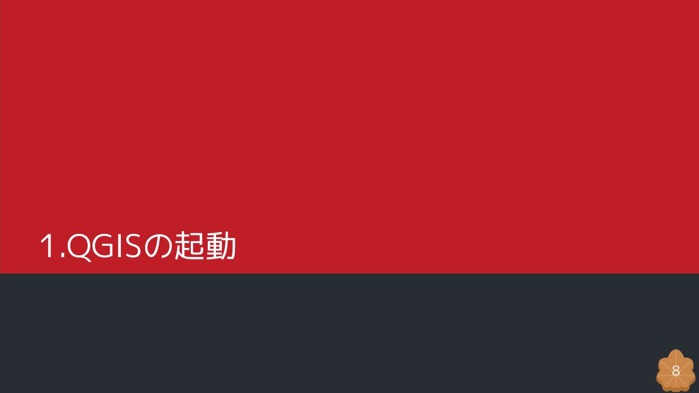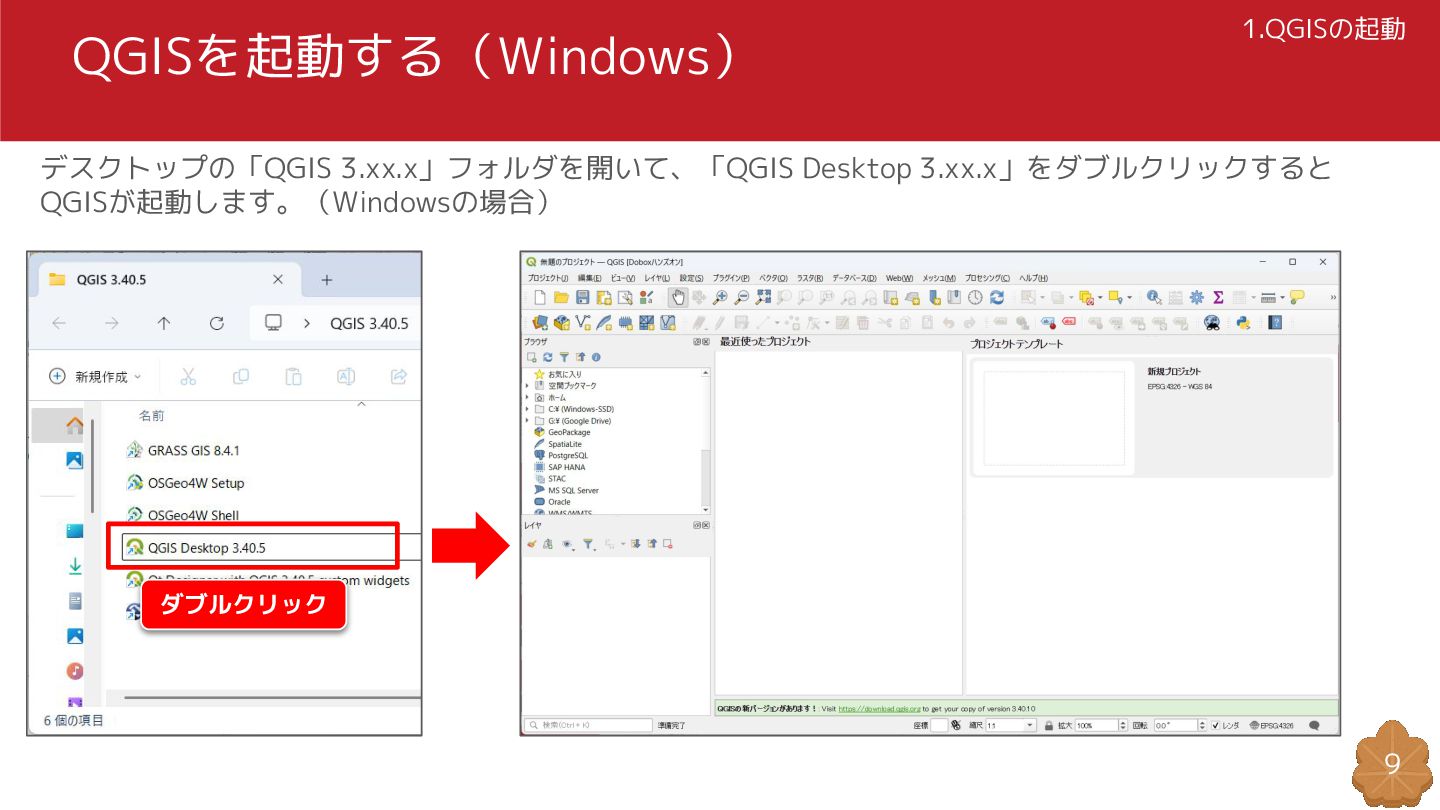 QGISを起動する(Windows) 9 デスクトップの「QGIS 3.xx.x」フォルダを開いて、「QGIS Desktop 3.xx.x」をダブルクリックすると QGISが起動します。(Windowsの場合) ダブルクリック 1.QGISの起動