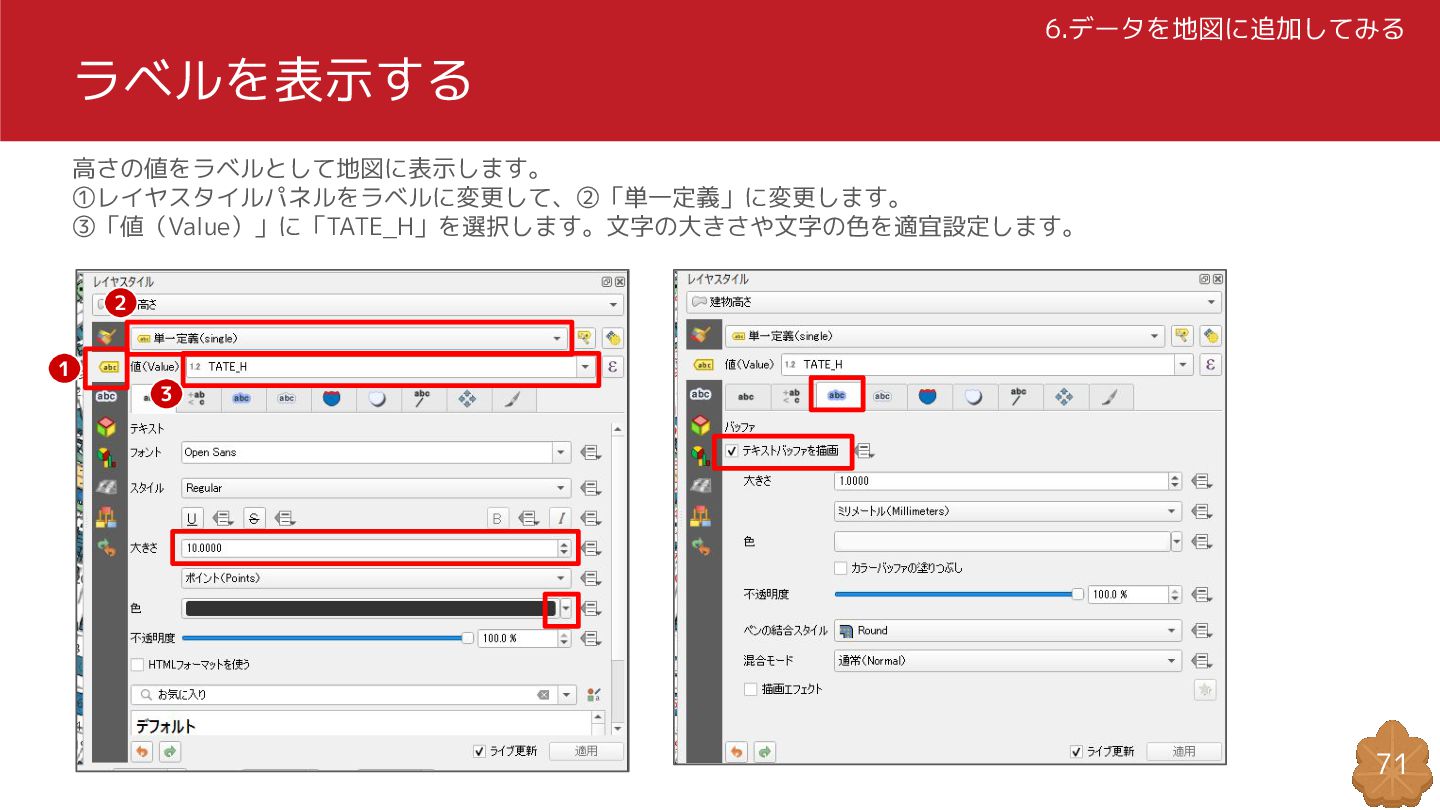ラベルを表示する 71 高さの値をラベルとして地図に表示します。 ①レイヤスタイルパネルをラベルに変更して、②「単一定義」に変更します。 ③「値(Value)」に「TATE_H」を選択します。文字の大きさや文字の色を適宜設定します。 6.データを地図に追加してみる 1 2 3