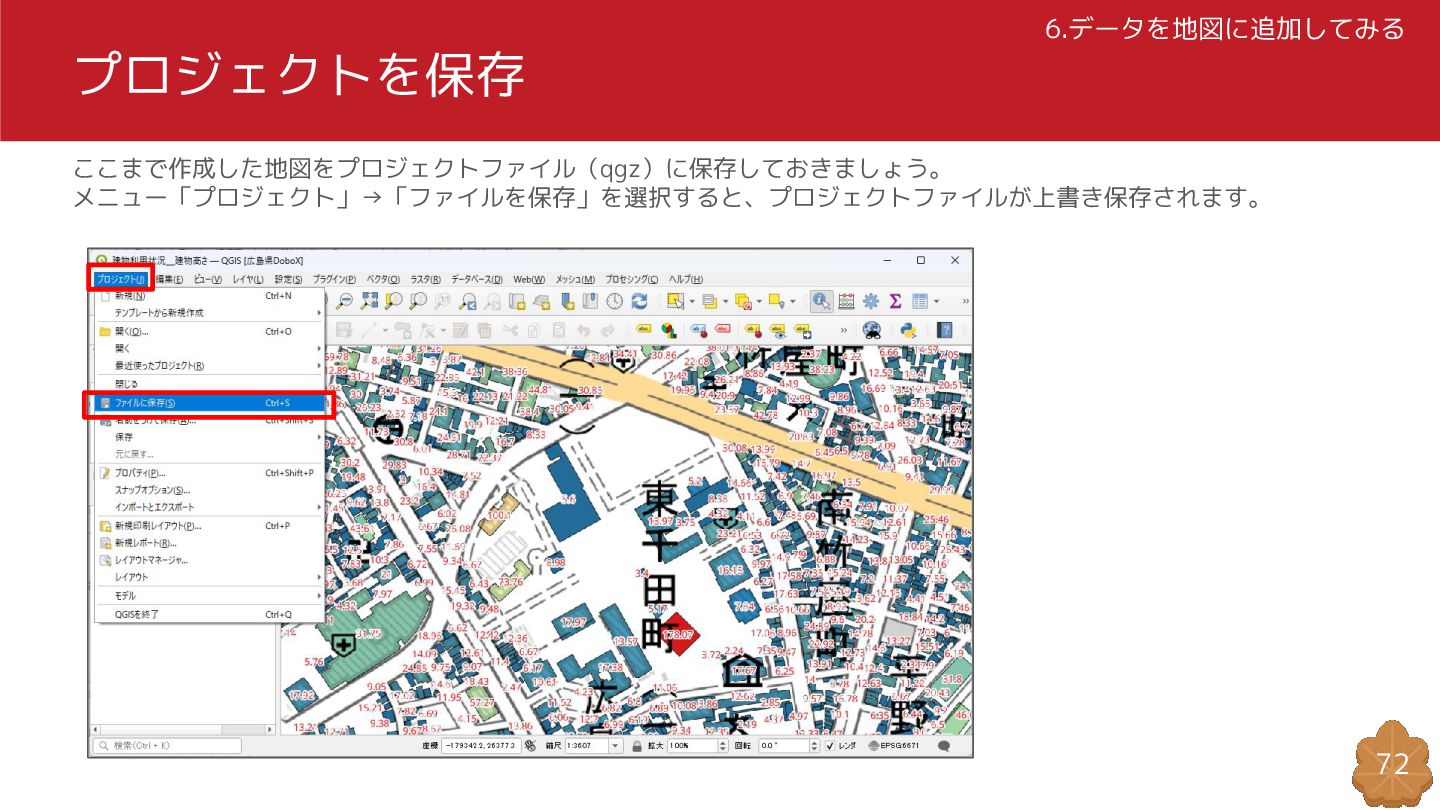 プロジェクトを保存 72 ここまで作成した地図をプロジェクトファイル(qgz)に保存しておきましょう。 メニュー「プロジェクト」→「ファイルを保存」を選択すると、プロジェクトファイルが上書き保存されます。 6.データを地図に追加してみる