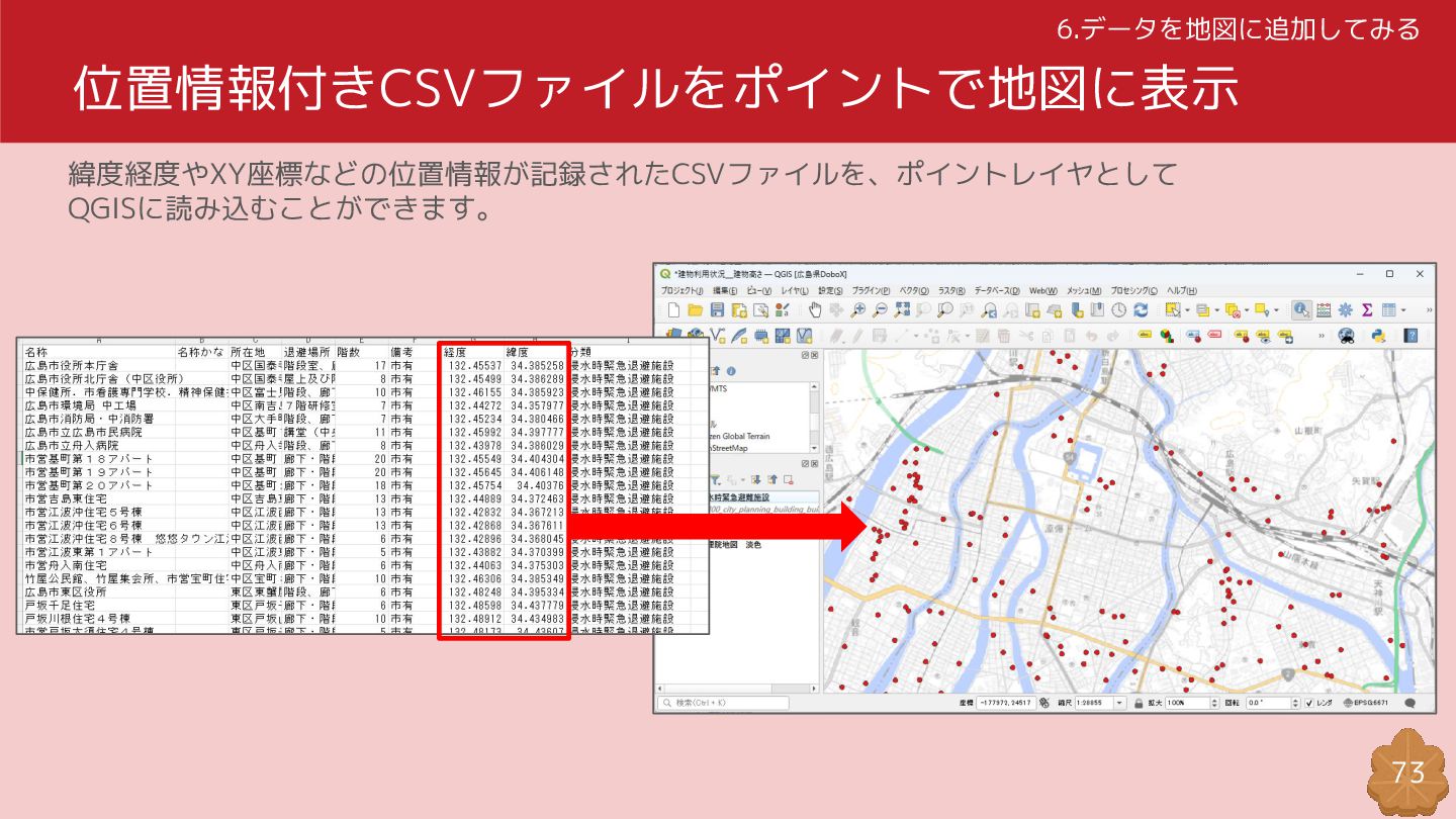 位置情報付きCSVファイルをポイントで地図に表示 73 緯度経度やXY座標などの位置情報が記録されたCSVファイルを、ポイントレイヤとして QGISに読み込むことができます。 6.データを地図に追加してみる