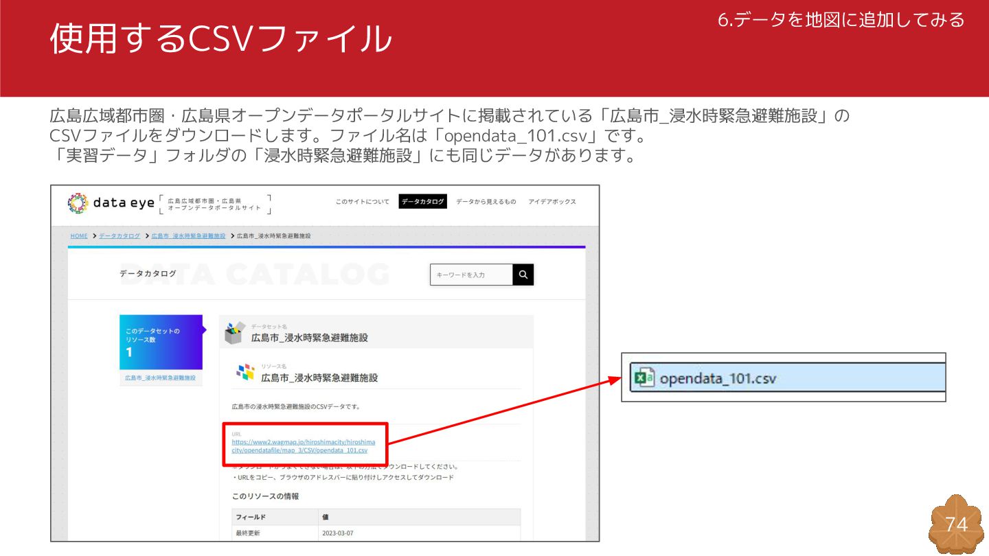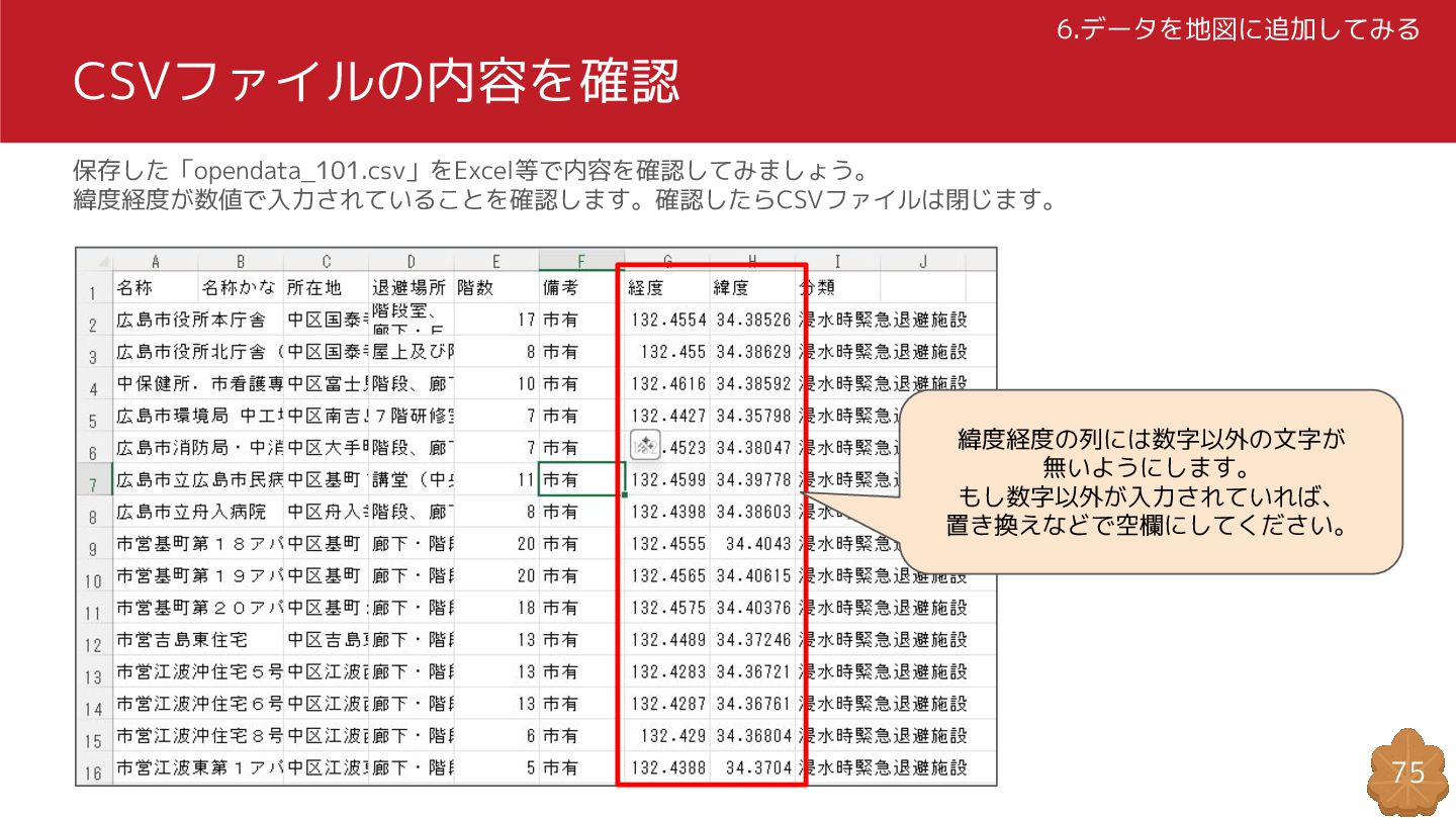 使用するCSVファイル 74 広島広域都市圏・広島県オープンデータポータルサイトに掲載されている「広島市_浸水時緊急避難施設」の CSVファイルをダウンロードします。ファイル名は「opendata_101.csv」です。 「実習データ」フォルダの「浸水時緊急避難施設」にも同じデータがあります。 6.データを地図に追加してみる