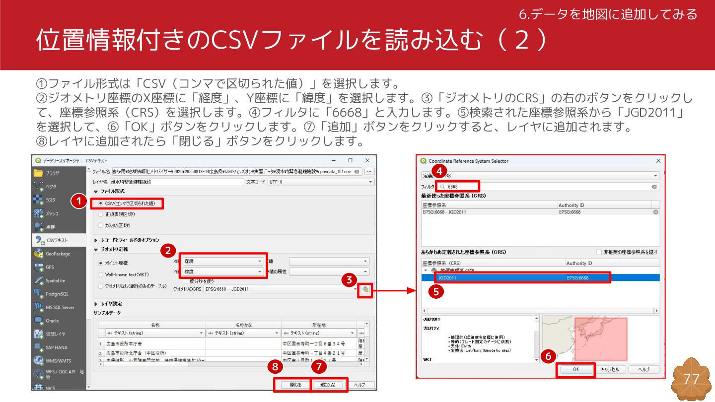 位置情報付きのCSVファイルを読み込む(1) 76 位置情報付きCSVはデータソースマネージャ」で読み込みます。①メニュー「レイヤ」→「データソースマネージャ」を選 択します。 ②「CSVテキスト」を選択します。③ファイル名の右の「…」ボタンでCSVファイルを選択します。 ④レイヤ名には「浸水時緊急避難施設」と入力します。⑤サンプルデータが文字化けしていれば文字コードを設定します。 6.データを地図に追加してみる 文字化けしていないか確認 文字コードは「Shift_JIS」か 「UTF-8」のどちらか