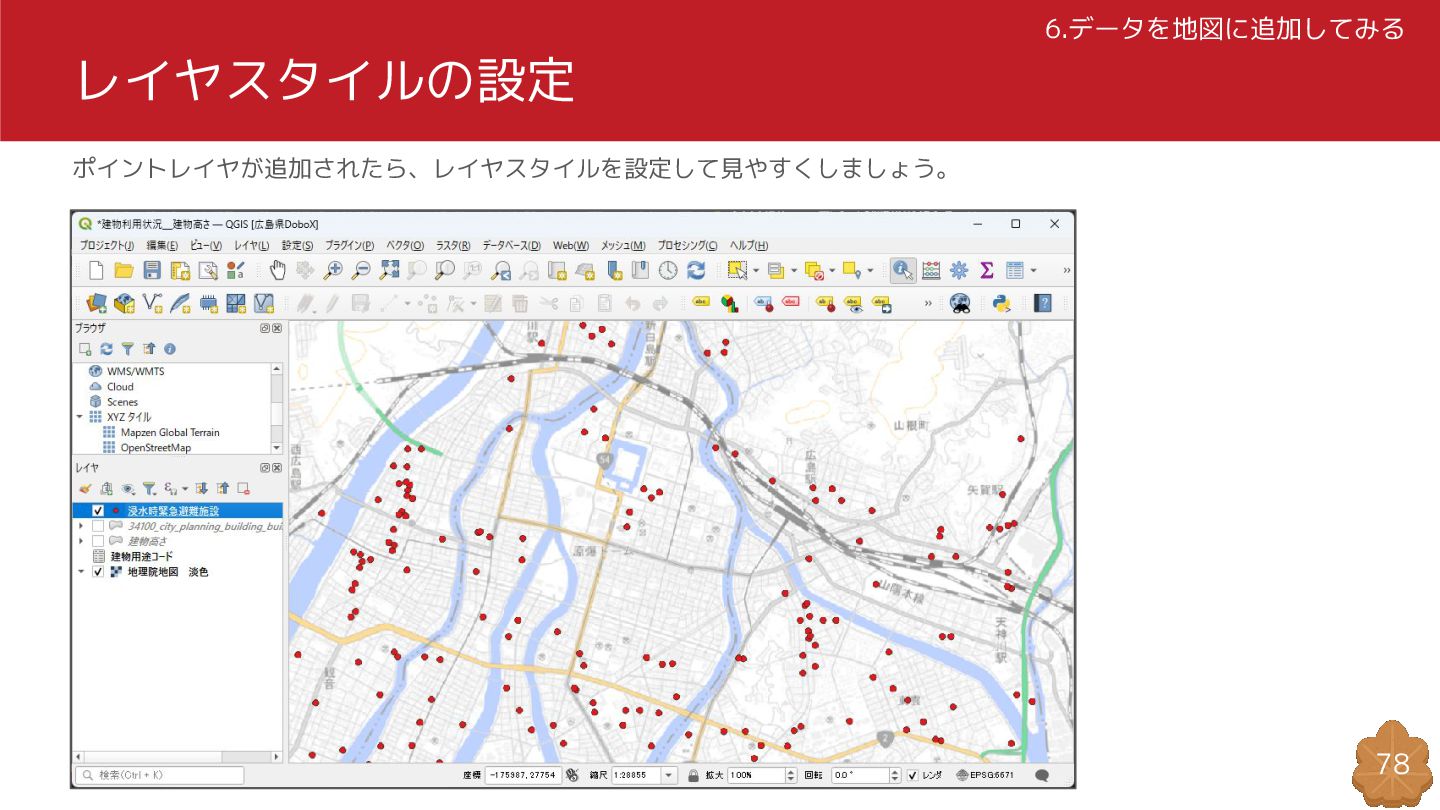 レイヤスタイルの設定 78 ポイントレイヤが追加されたら、レイヤスタイルを設定して見やすくしましょう。 6.データを地図に追加してみる