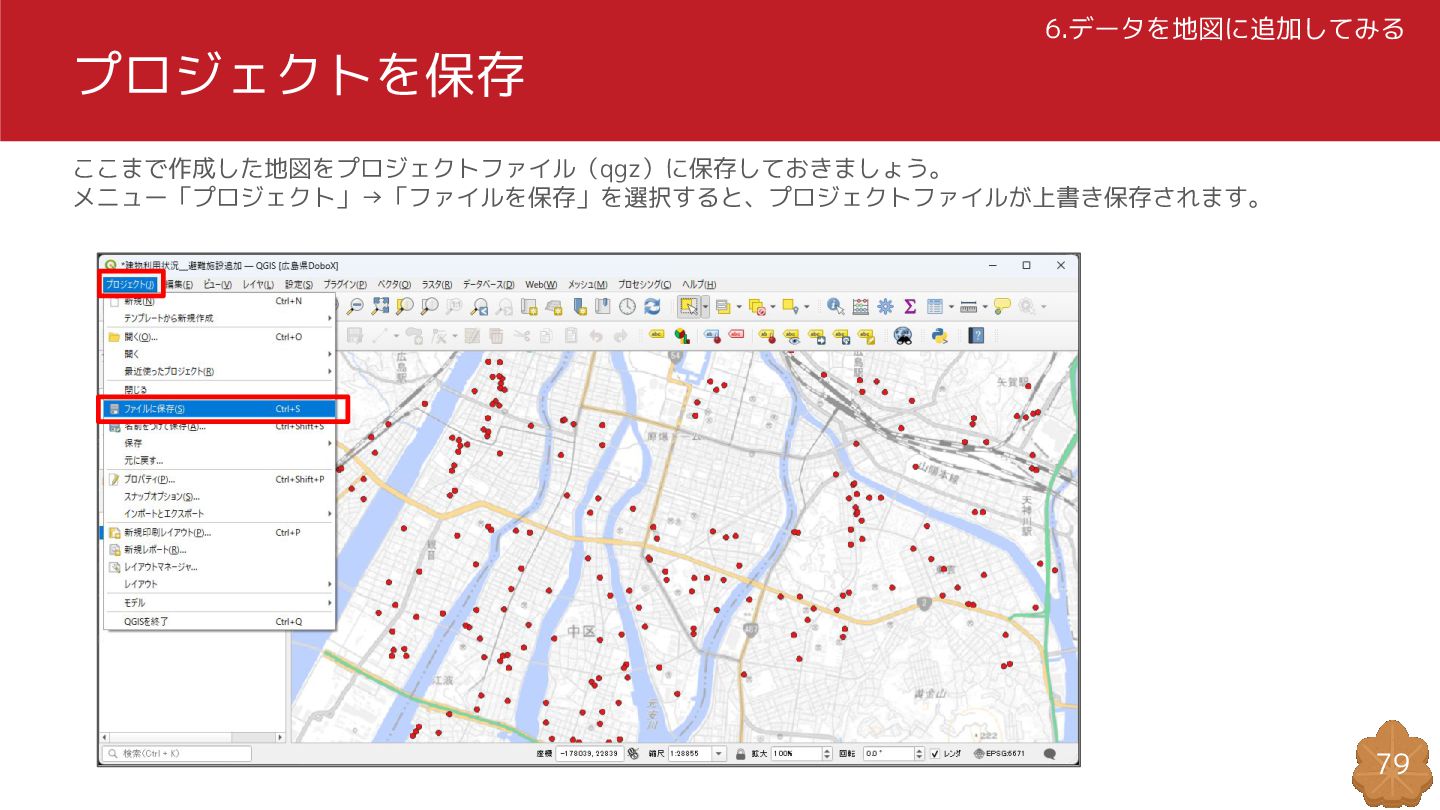 プロジェクトを保存 79 ここまで作成した地図をプロジェクトファイル(qgz)に保存しておきましょう。 メニュー「プロジェクト」→「ファイルを保存」を選択すると、プロジェクトファイルが上書き保存されます。 6.データを地図に追加してみる