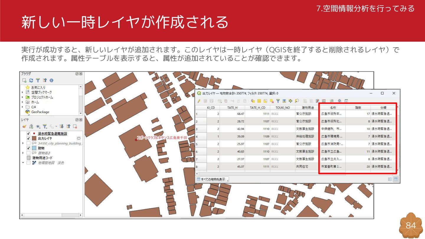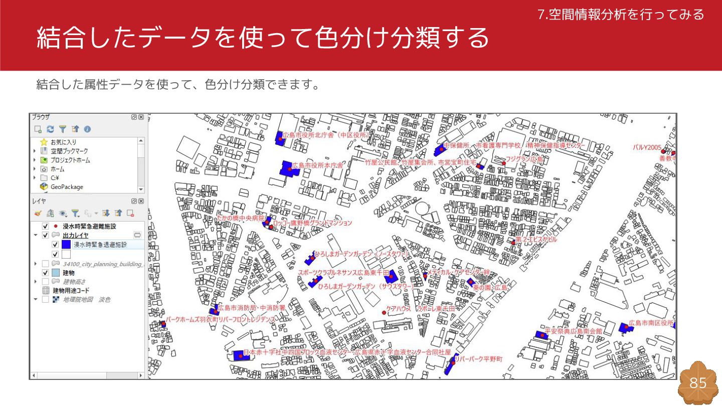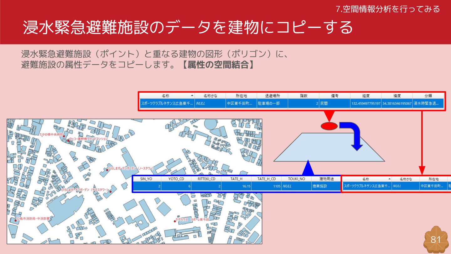 浸水緊急避難施設のデータを建物にコピーする 81 浸水緊急避難施設(ポイント)と重なる建物の図形(ポリゴン)に、 避難施設の属性データをコピーします。【属性の空間結合】 7.空間情報分析を行ってみる